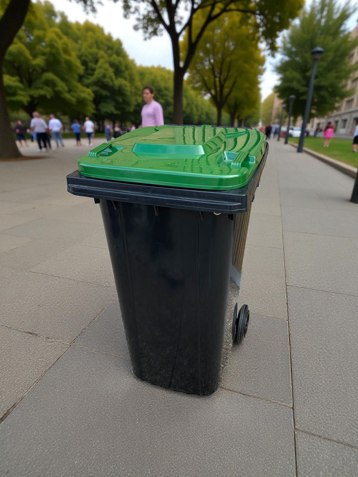 240-litre, 2-wheeled street rubbish container with green lid. Robust, high-strength polyethylene. Complies with EN840 standard.
