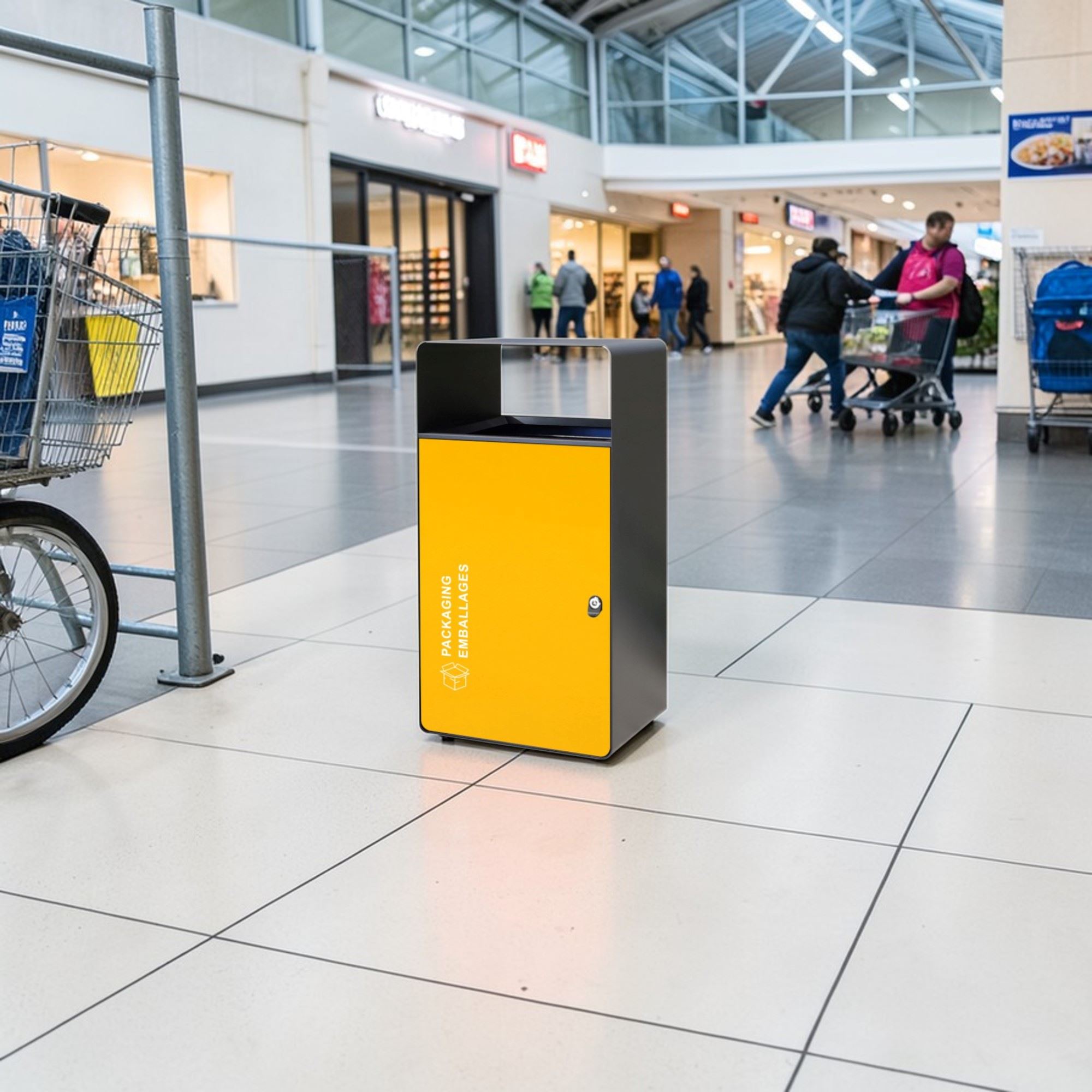 67L cube-shaped yellow recycling bin. For indoor or outdoor use. Galvanized steel. Lockable. 67L internal capacity. French and English packaging labeling. Can be fixed to the ground.