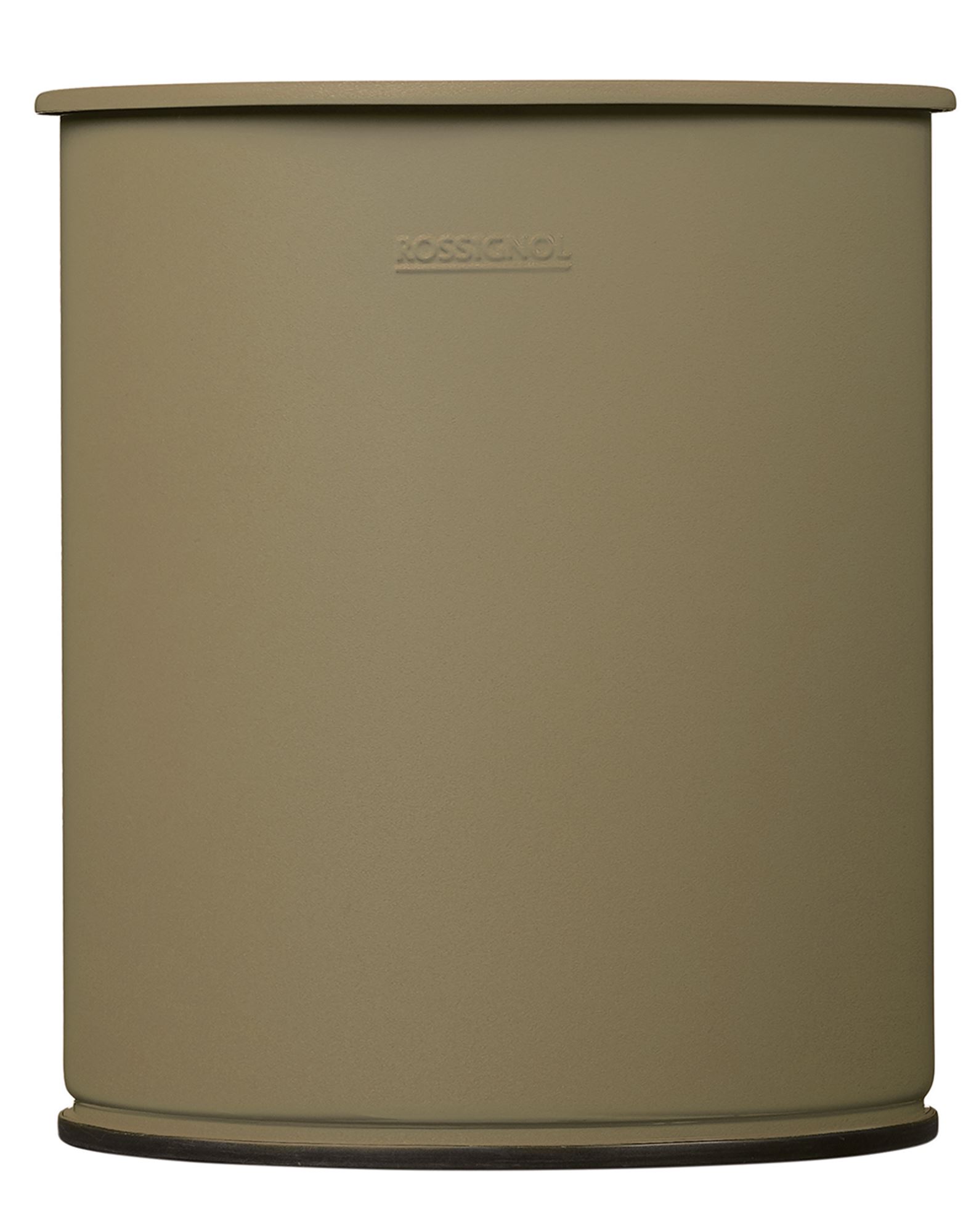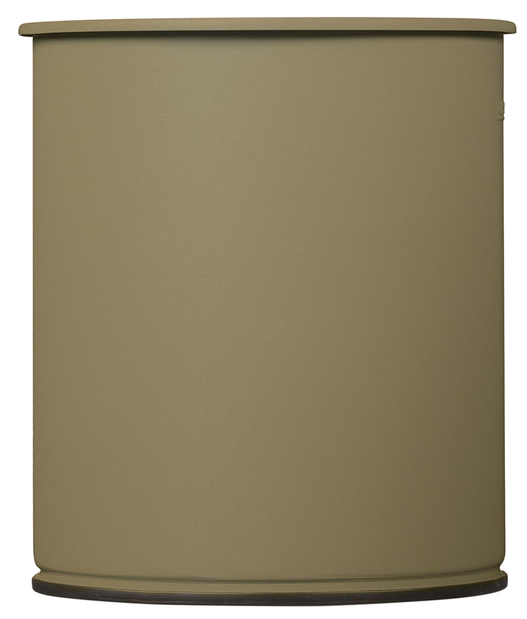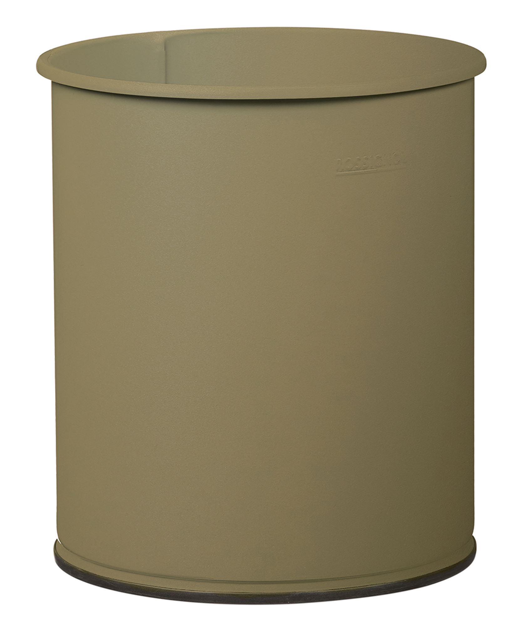 Epoxy-coated steel office wastebasket made in France by Rossignol. 8-liter capacity. Olive gray color. Anti-tip and anti-scratch base.