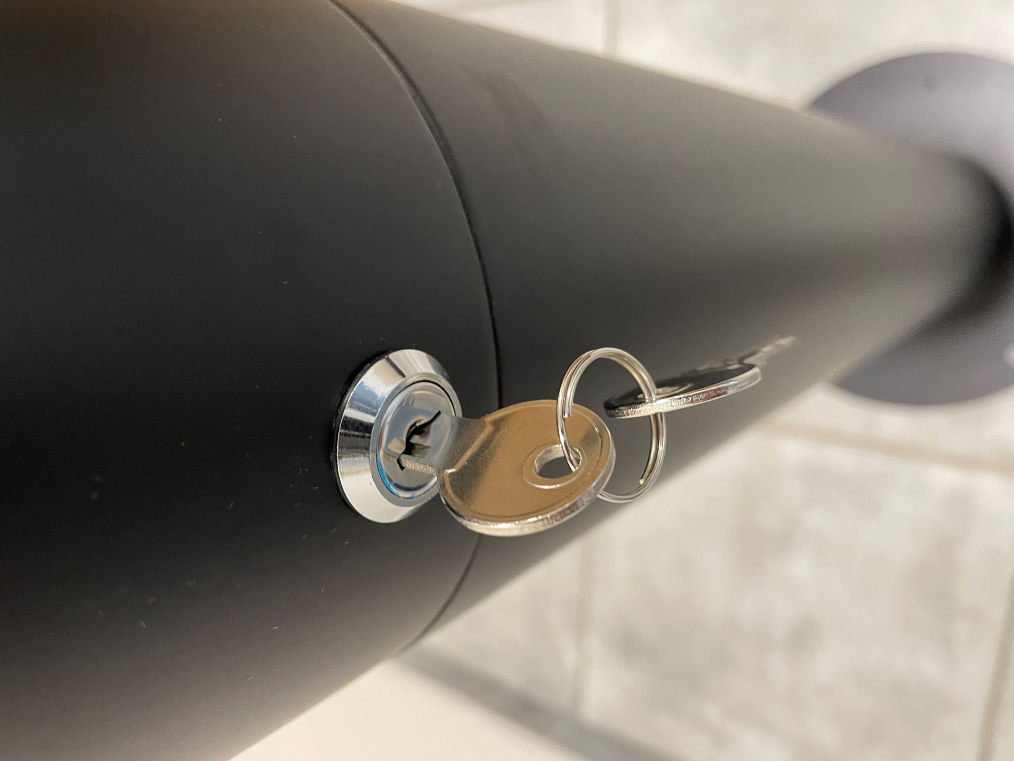 This freestanding, totem-style outdoor ashtray is fully galvanized and resistant to weathering and UV rays. It features a clean and discreet design, a lockable door, and an 8-liter capacity.