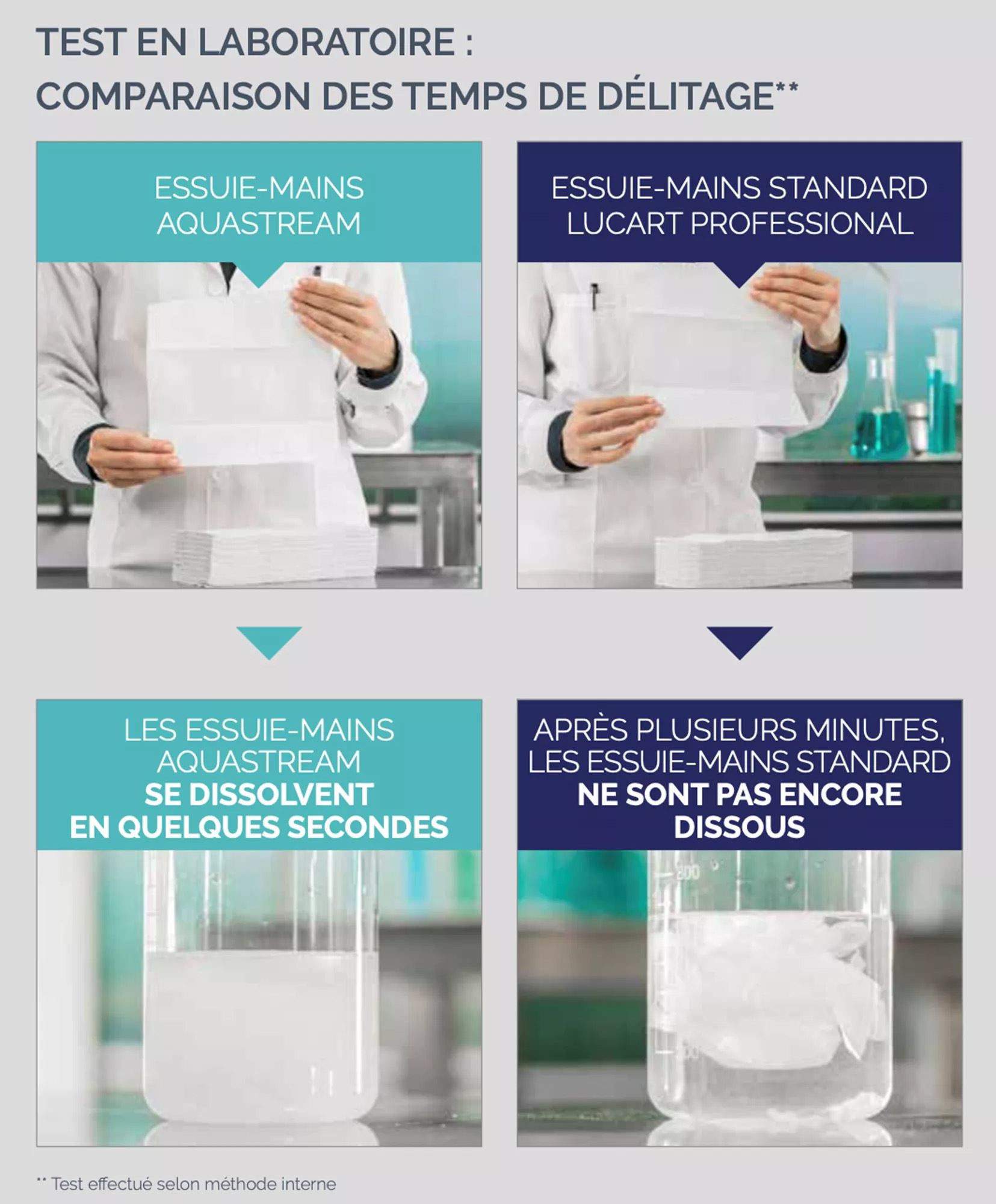 Le papier toilette Aquastream se dissout dans l'eau en 7 secondes. Ce papier toilette paquet plat à dissolution rapide est idéal pour bateau, camping, hôtel, trains, stations balnéaires mais aussi dans les entreprises ayant un soucis de canalisation récurrent.