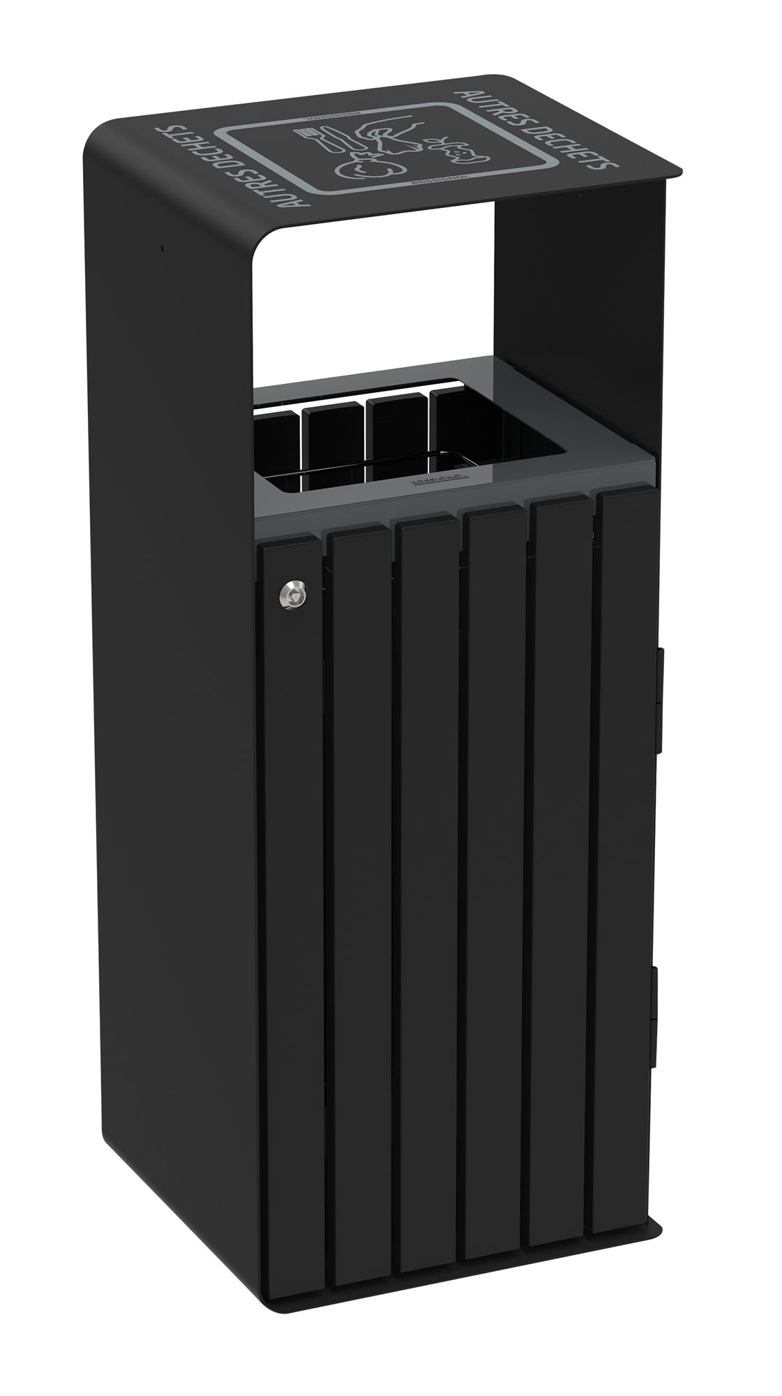 Managing outdoor waste while maintaining visual consistency is a key challenge. This bin with a calibrated opening simplifies its use while blending seamlessly into its surroundings. Its steel and aluminum construction ensures both robustness and aesthetic appeal. It can be used alone or in conjunction with other bins to create a clear and organized recycling area.