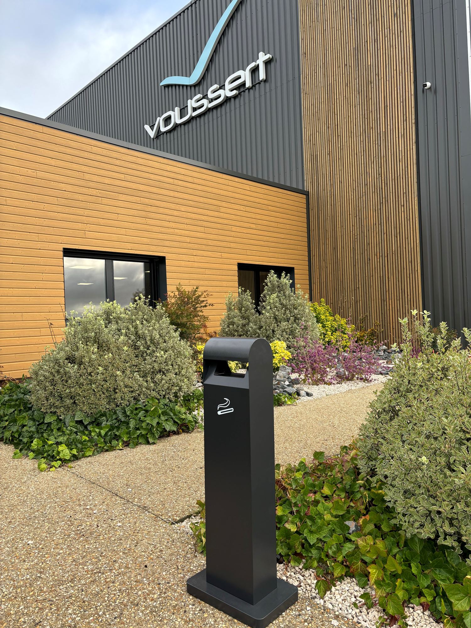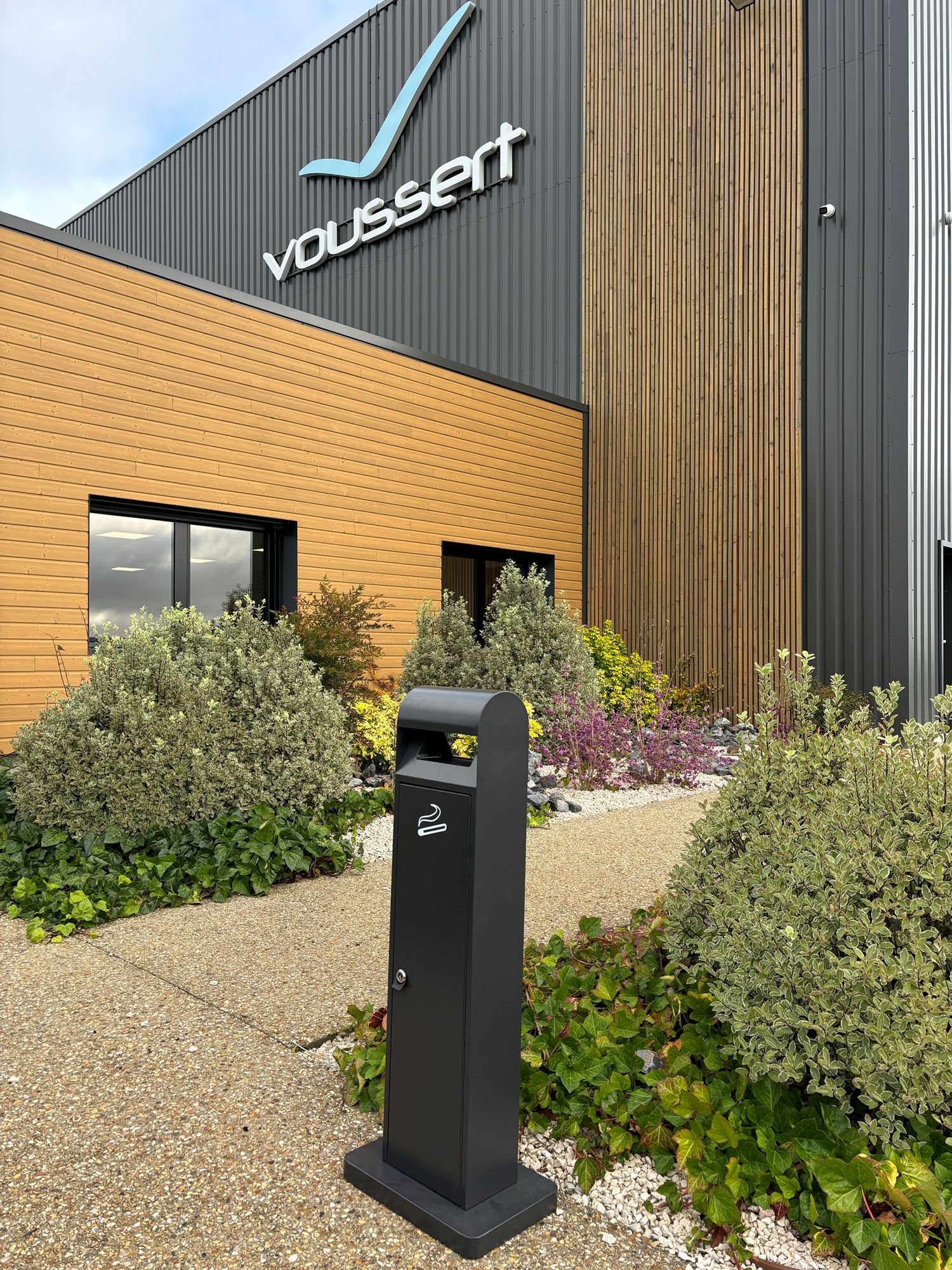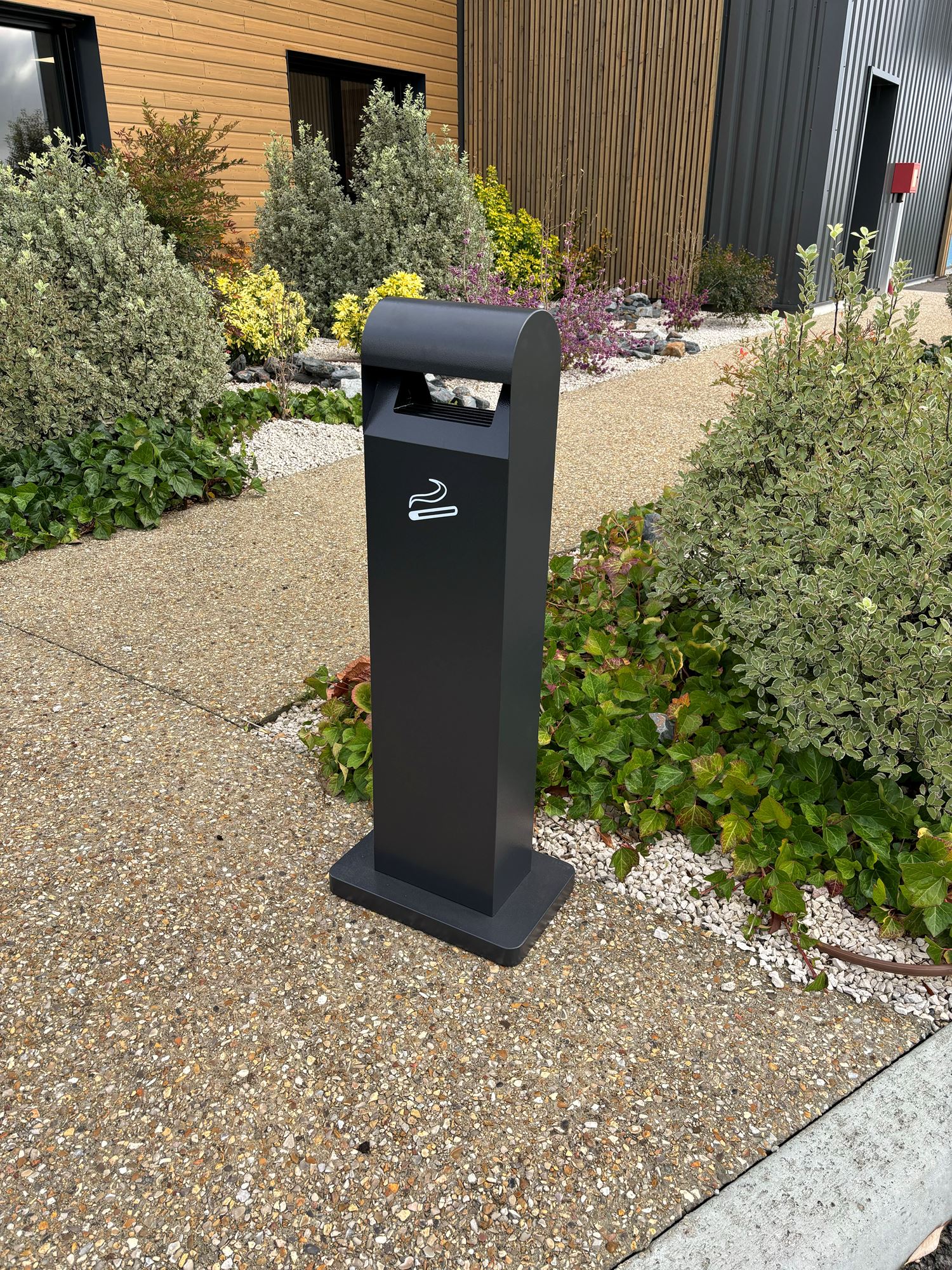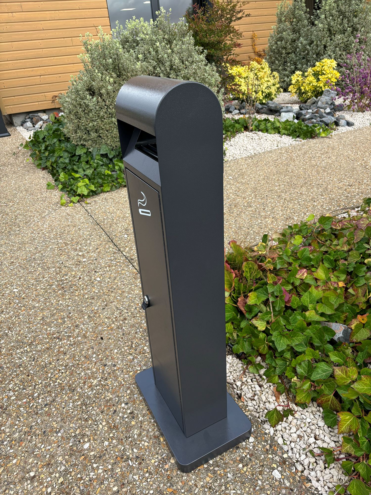 The freestanding ashtray is designed by drawing inspiration from the rounded top shape of a kilometer marker, allowing water to avoid stagnation.