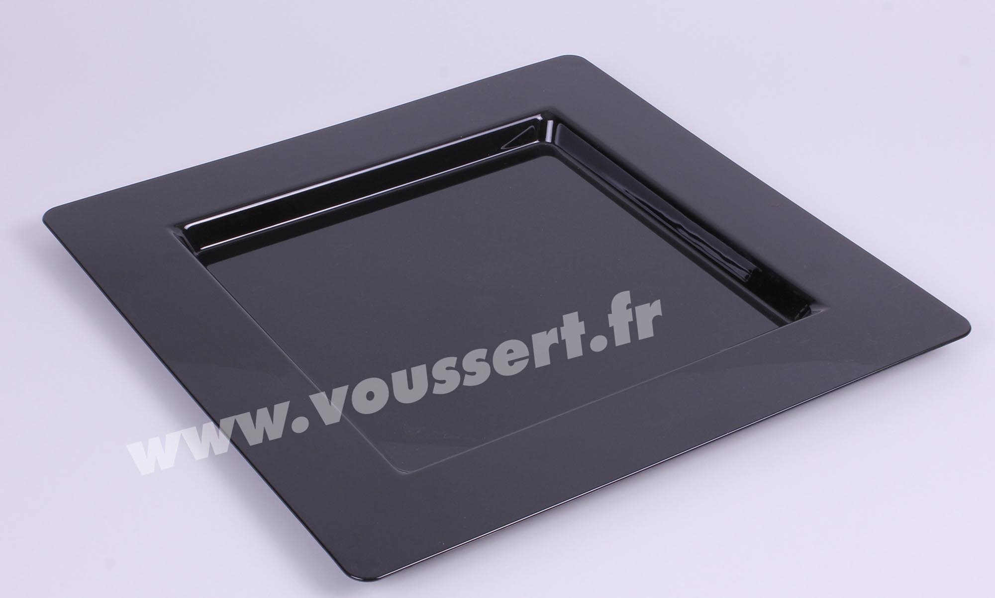 Reusable plastic underplate in black, square shape, 298x298 mm. Underplate made in France in PS. Reusable and food contact.