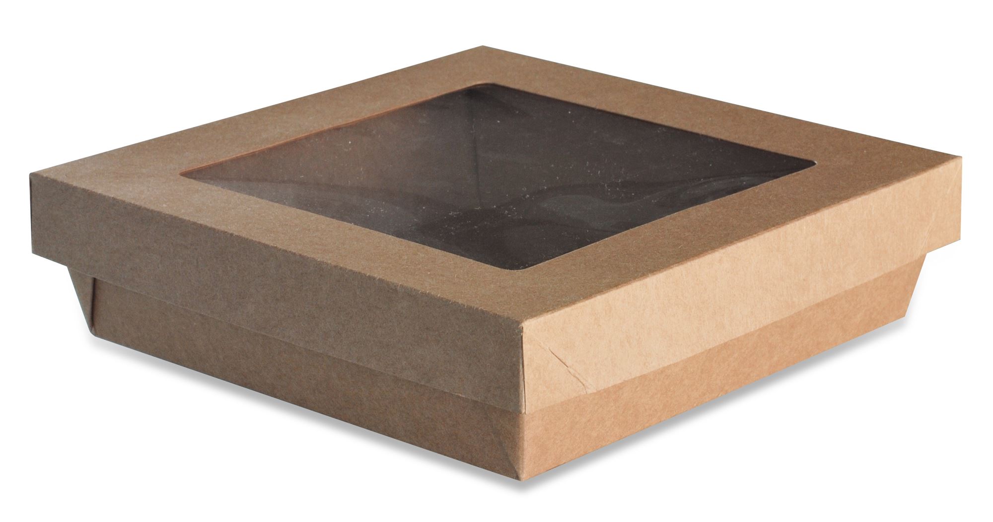 Cardboard salad box with cover and presentation window. The cardboard box is in brown kraft as well as the lid with an upper window in order to quickly visualize the contents.