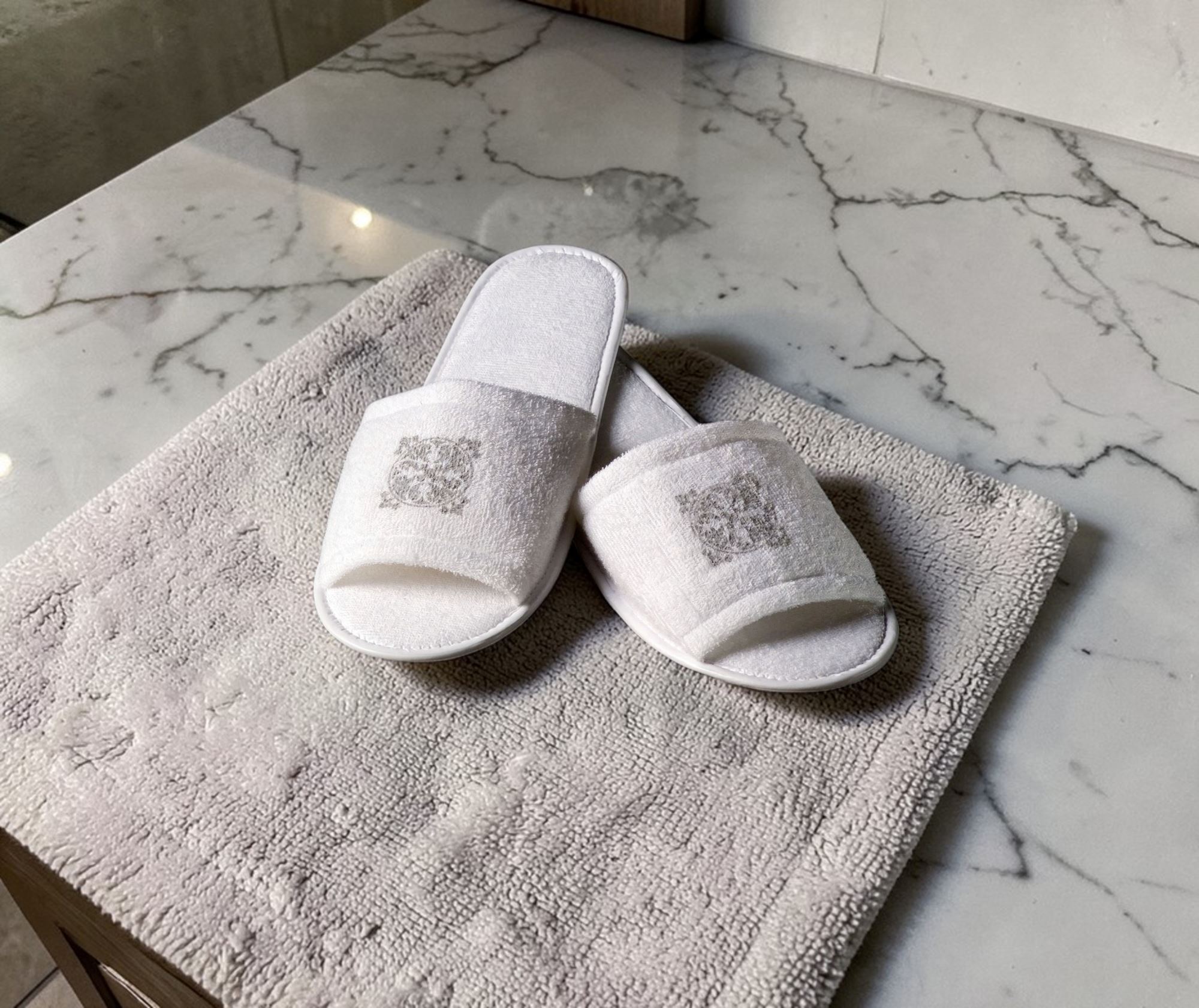 White hotel slipper with the Acanto line logo. The presence of welcome slippers in your establishment will bring a premium touch to your hotel or guest house on a simple detail.