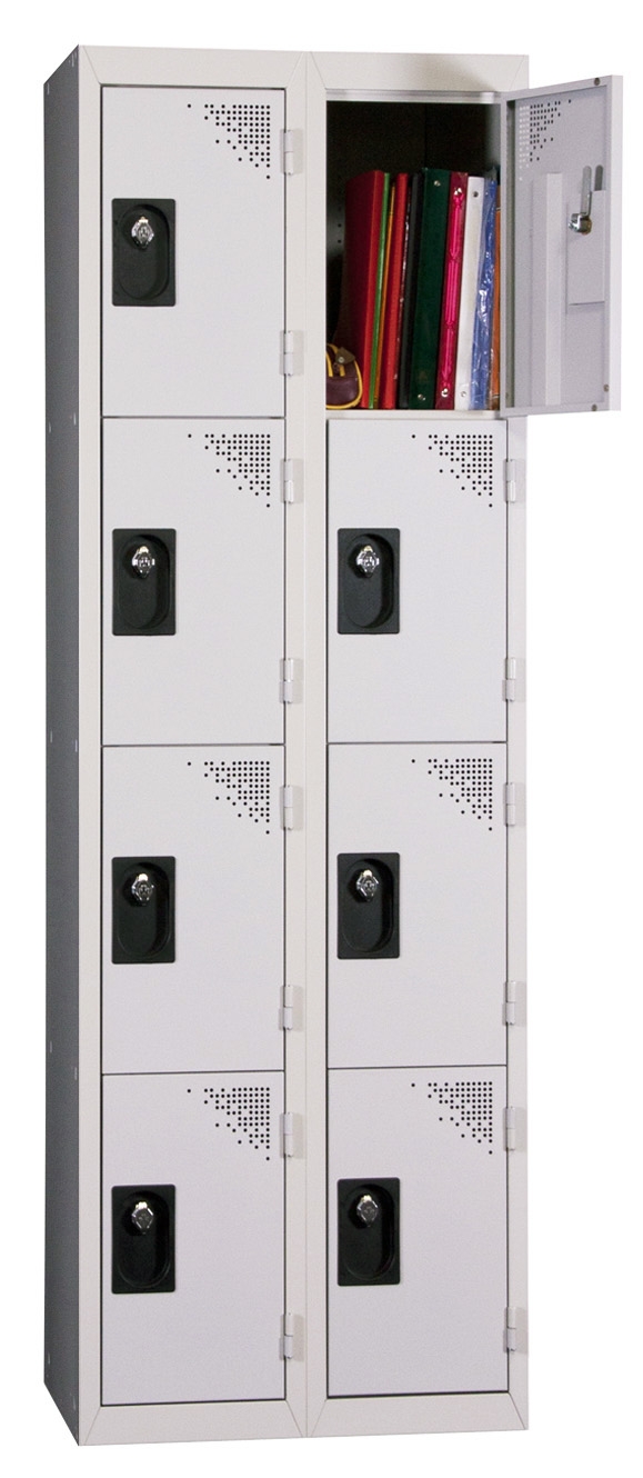 Multi-compartment locker with 4 stacked compartments and 2 columns, 400mm wide. This locker is delivered assembled and ready to use. Ideal for public facilities.