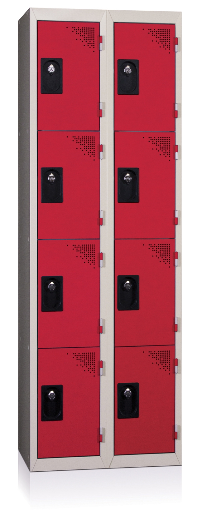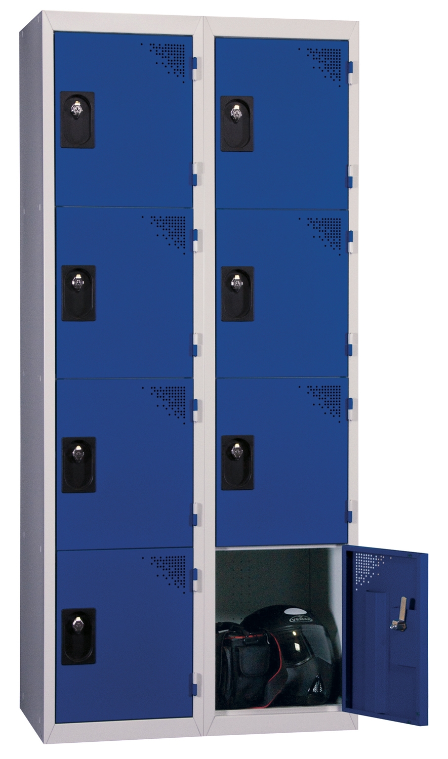 Multicase piece cloakroom, 4 boxes stacked, 2 columns. Plastic adhesive label holder. Metal body with structural reinforcement. Door with assoudisseurs optimized for your back full height confort.Ventilation. Door with omega vertical reinforcement. Closure system lock (padlock hasp or other request please contact us). Antidégondable exclusive and patented EVP, door to travel 180 °. 7/10ths thickness as standard. Colors on stock: Grey Body Ral 7035, Ral 7035 Grey Door, Blue Ral 5005, Ral 3003 Red, Anthracite RAL 7016 (other colors are subject to a surcharge and a longer time, please contact us). Dimensions: 1800mm x 800mm x 500mm (H x W x D Top). Cloakroom ready after unpacking.