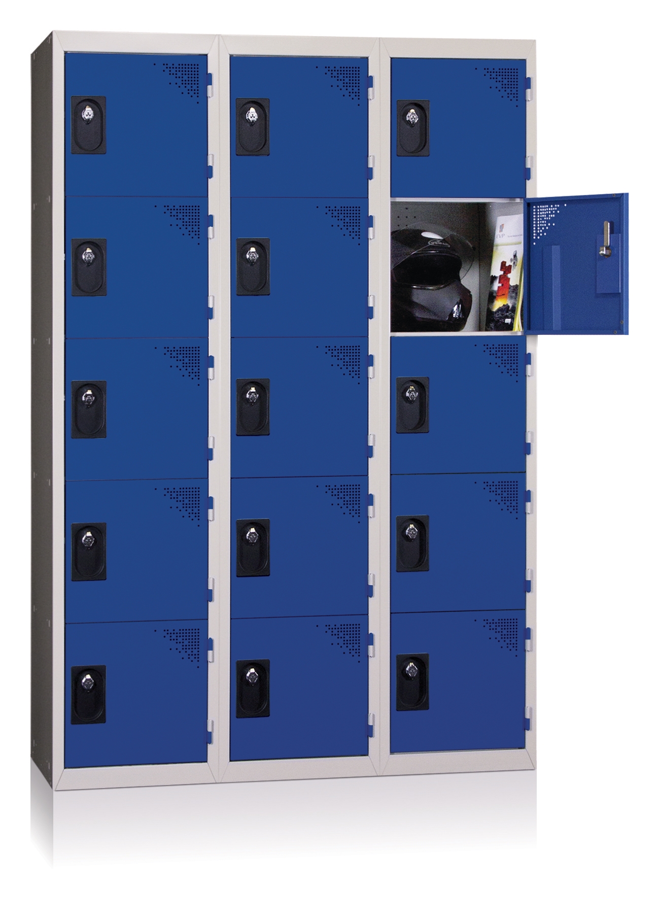 Multicase piece cloakroom, 5 boxes stacked, 3 columns. Plastic adhesive label holder. Metal body with structural reinforcement. Door with assoudisseurs optimized for your back full height confort.Ventilation. Door with omega vertical reinforcement. Closure system lock (padlock hasp or other request please contact us). Antidégondable exclusive and patented EVP, door to travel 180 °. 7/10ths thickness as standard. Colors on stock: Grey Body Ral 7035, Ral 7035 Grey Door, Blue Ral 5005, Ral 3003 Red, Anthracite RAL 7016 (other colors are subject to a surcharge and a longer time, please contact us). Dimensions: 1800mm x 900mm x 500mm (H x W x D Top). Cloakroom ready after unpacking.