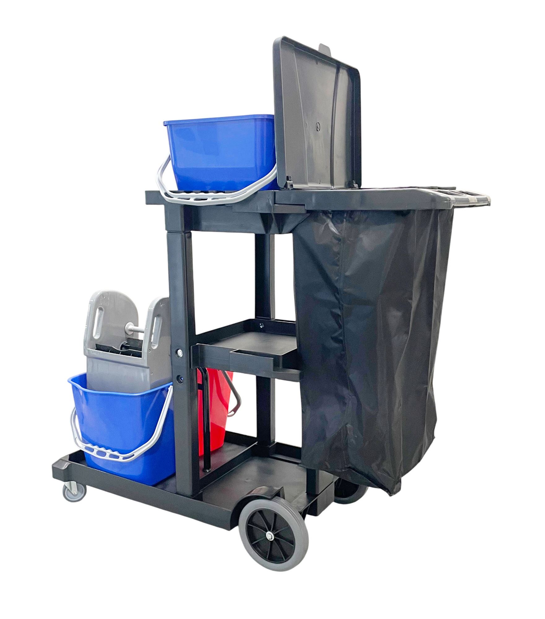 Professional 3-tier cleaning trolley. Jaw press. Bag holder with reusable and washable vinyl bag.