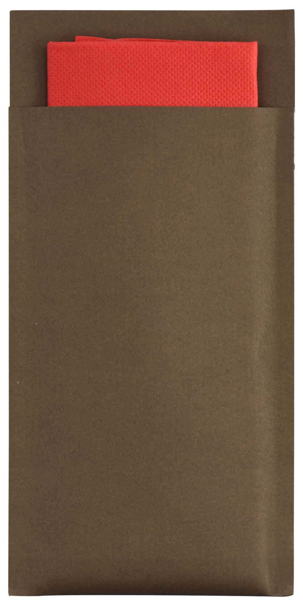 The cutlery pouch incorporates a red Celi-Ouate napkin inserted into a chocolate-coloured pouch to accommodate the cutlery. Neat presentation and guaranteed time savings!