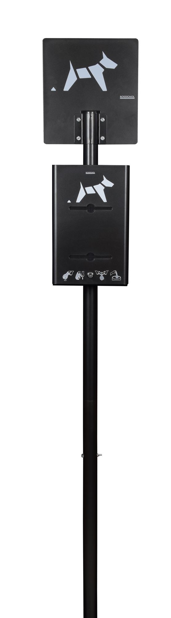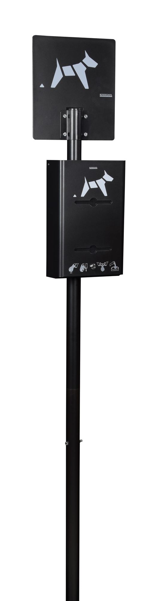 Rossignol canine bollard on pole with integrated bag dispenser. A simple and effective solution to meet the concerns of cleanliness of the road.