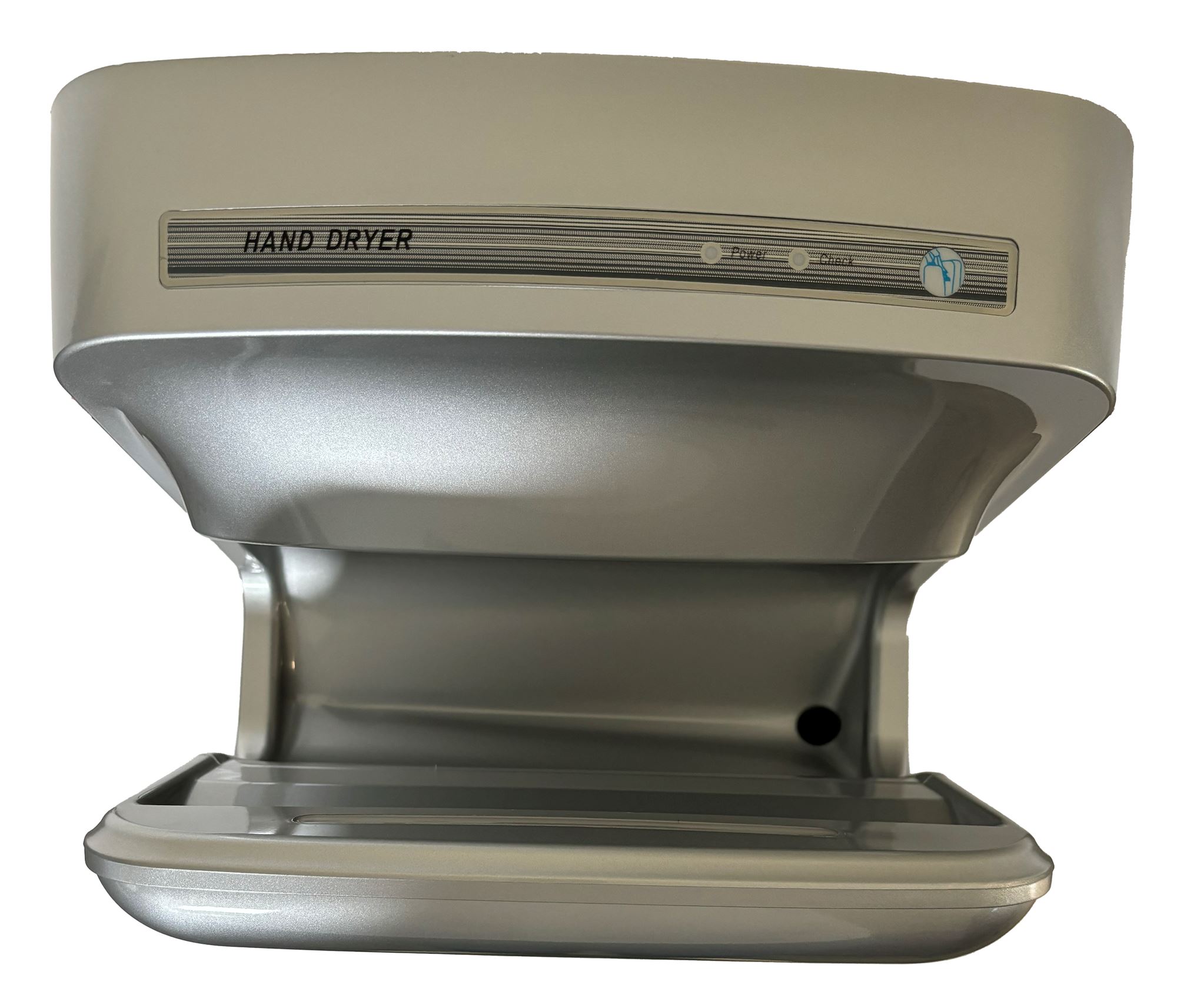 Metal gray vertical forced air hand dryer. Class II IPX4. CE and RoHS certified. Heating element. White ABS cover. Air speed 324 km/h. Drying time 7 to 10 seconds. Direct from the manufacturer.