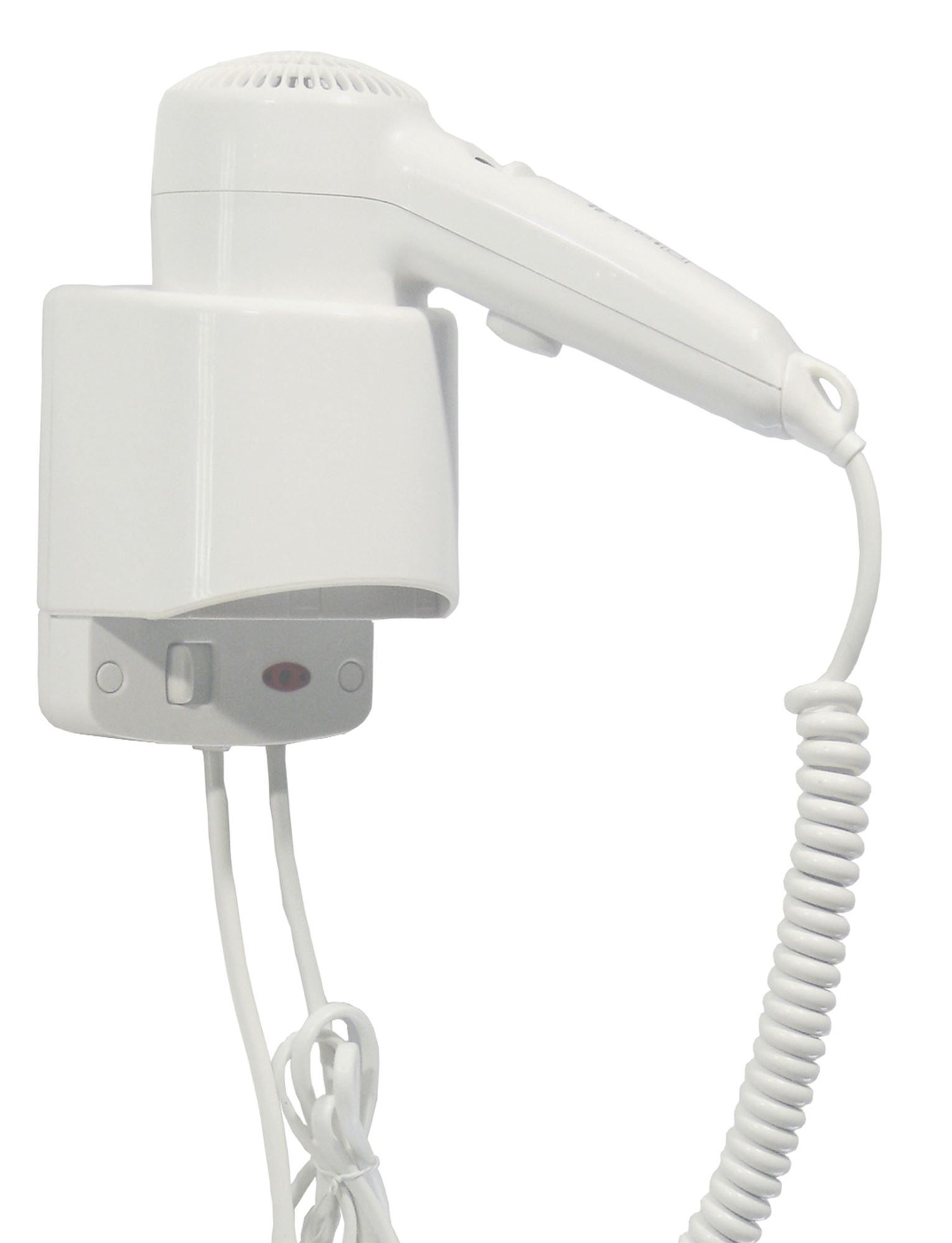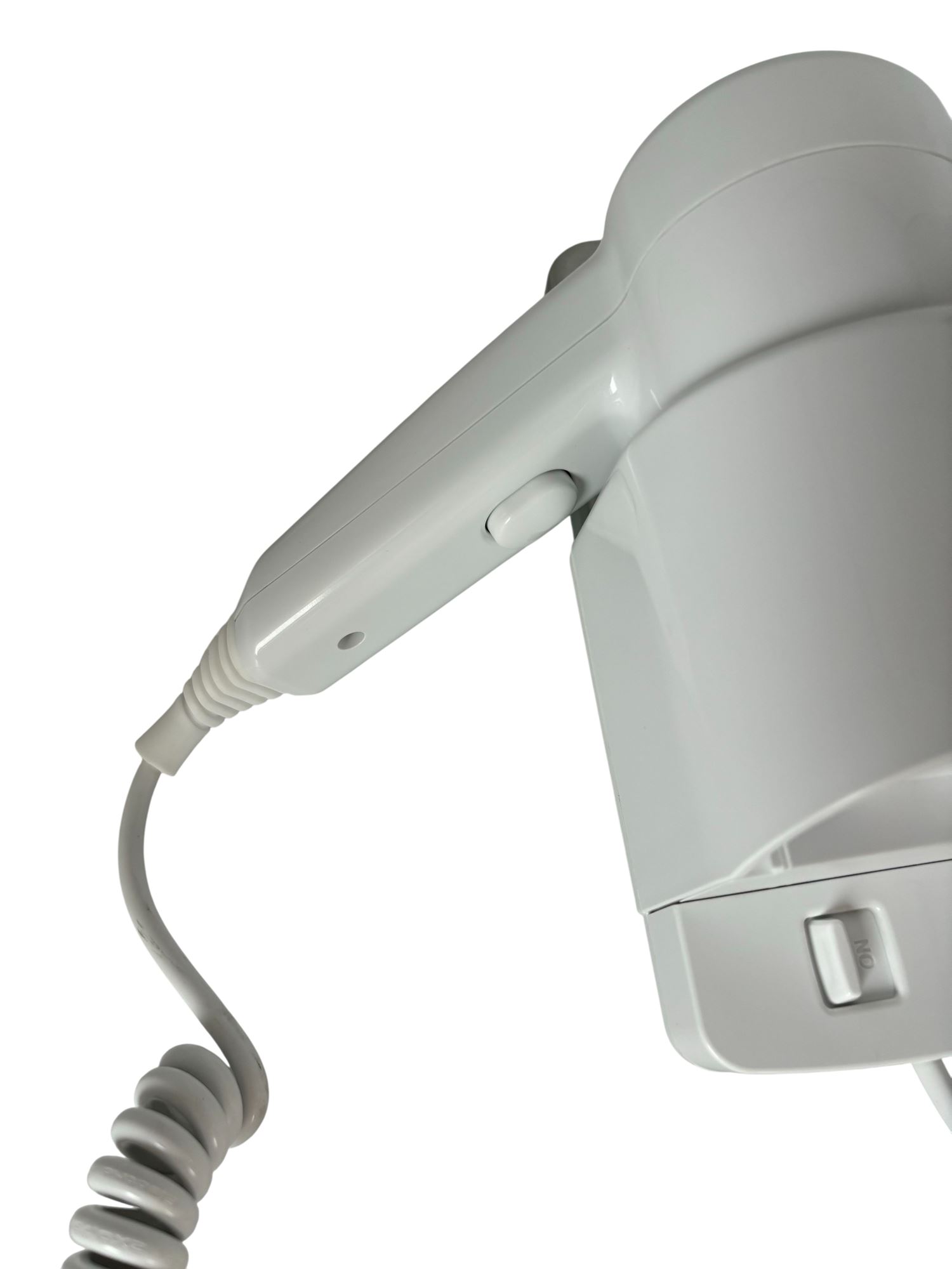 White ABS hotel hair dryer. Wall-mounted. 1200 watts. Class II. CE and RoHS compliant. Safety thermostat. Push-button activation when held in hand. 2-year warranty.