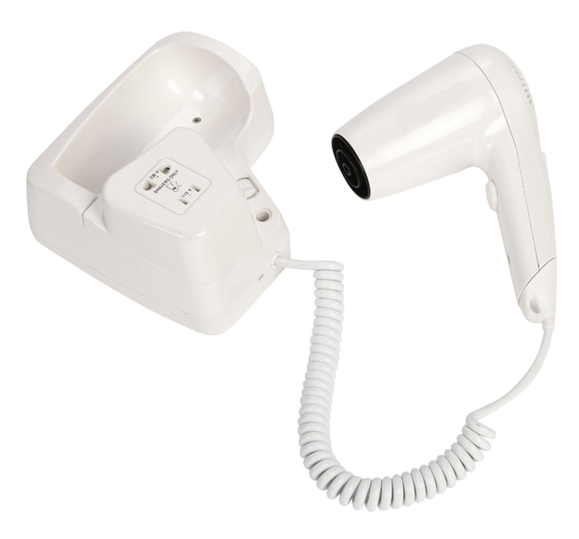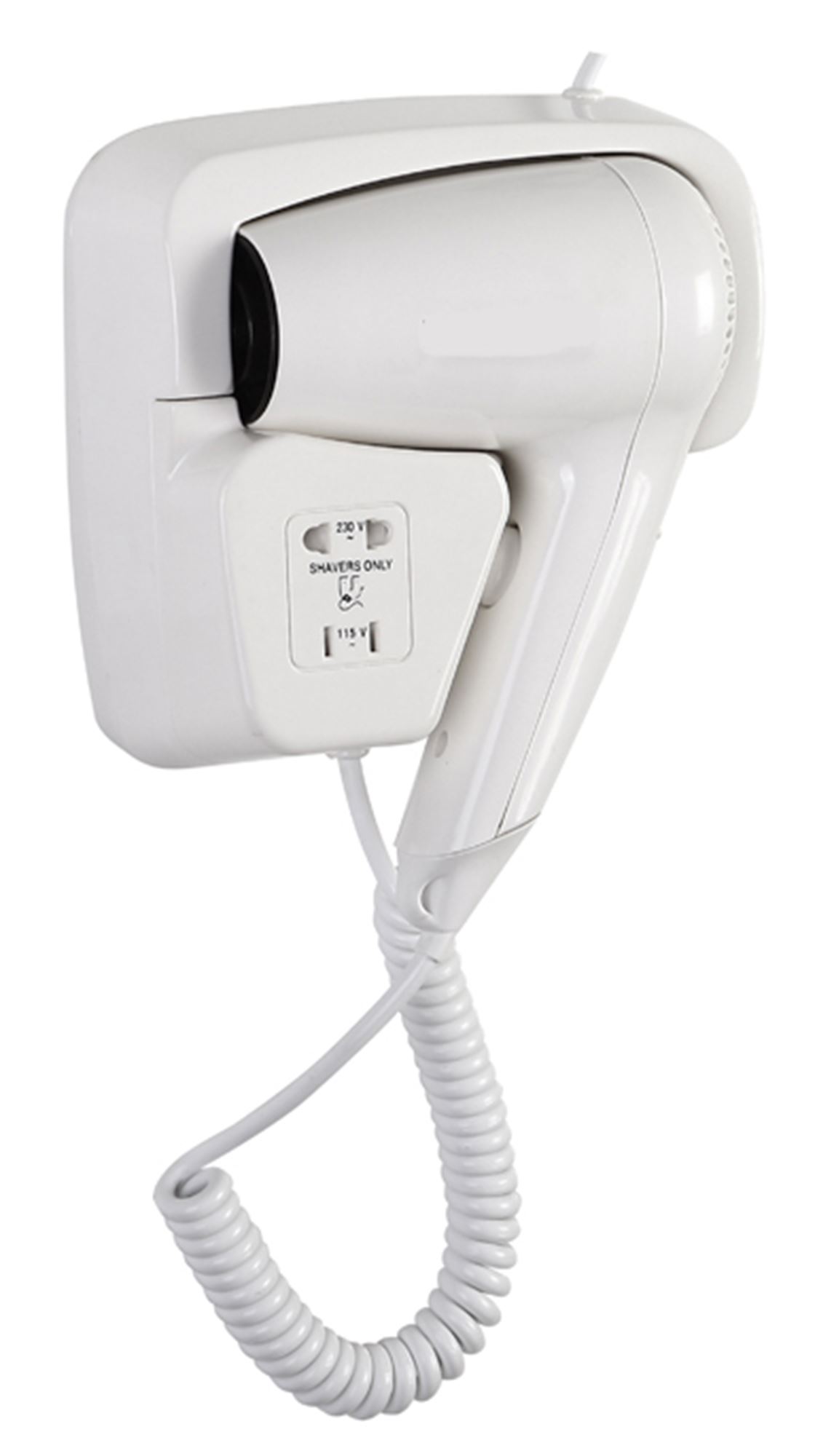 1200-watt hotel hair dryer. Comes with a wall mount. Two razor sockets. 1.2 m long hose. 2-year warranty.