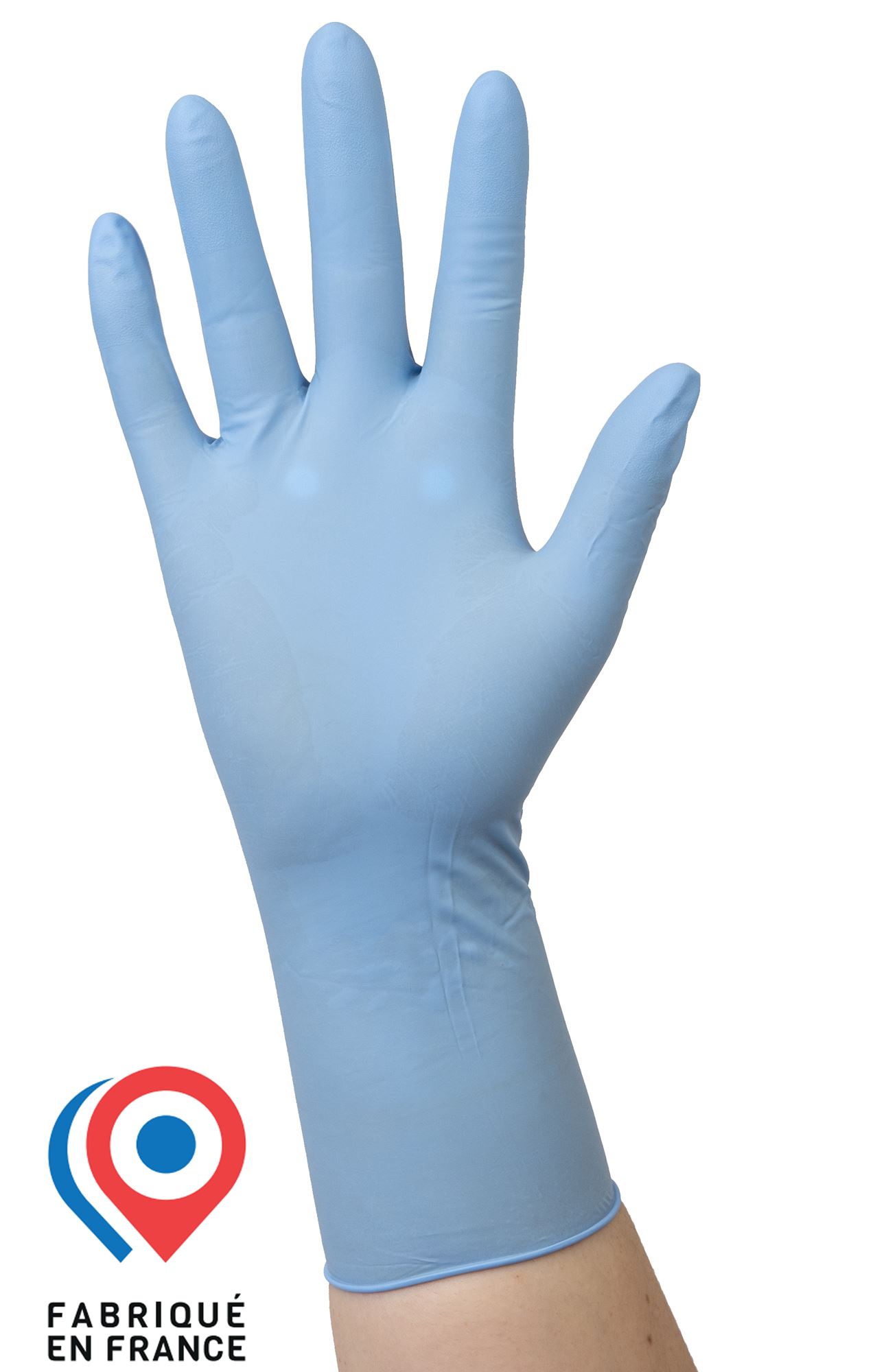 Kolmi Medicom blue nitrile glove, long length 290 mm, powder-free. Made in France. Class I medical device. Cat III PPE. Accelerator-free => limits type IV allergies. Food contact. Compliant for handling pesticides, ISO 18889-2019 standard.