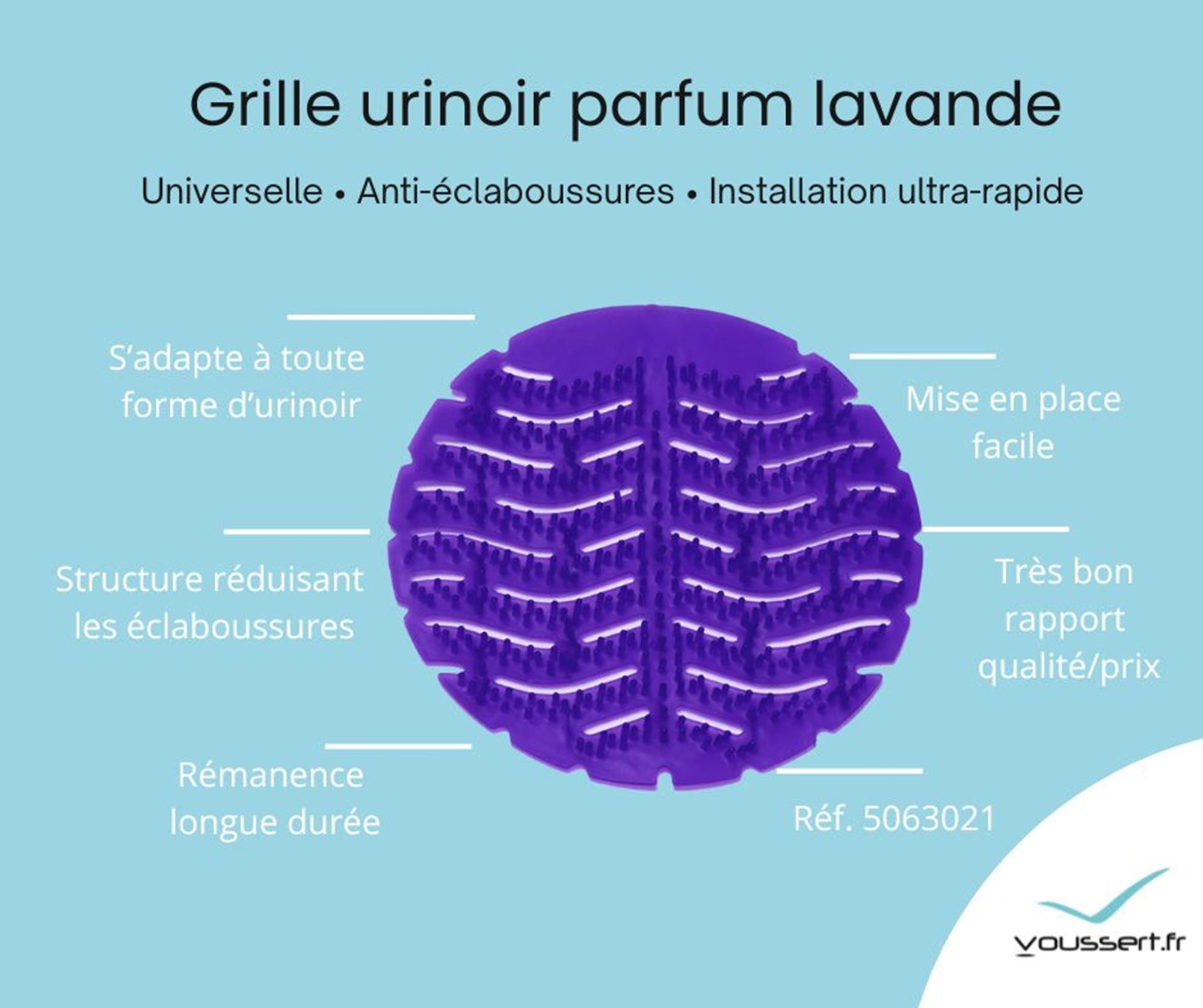 Lavender scented urinal screen. Splash-proof. Fits any urinal. Ideal for train stations, airports, concert halls, stadiums, etc., as well as restaurants and bars. Long-lasting scent.
