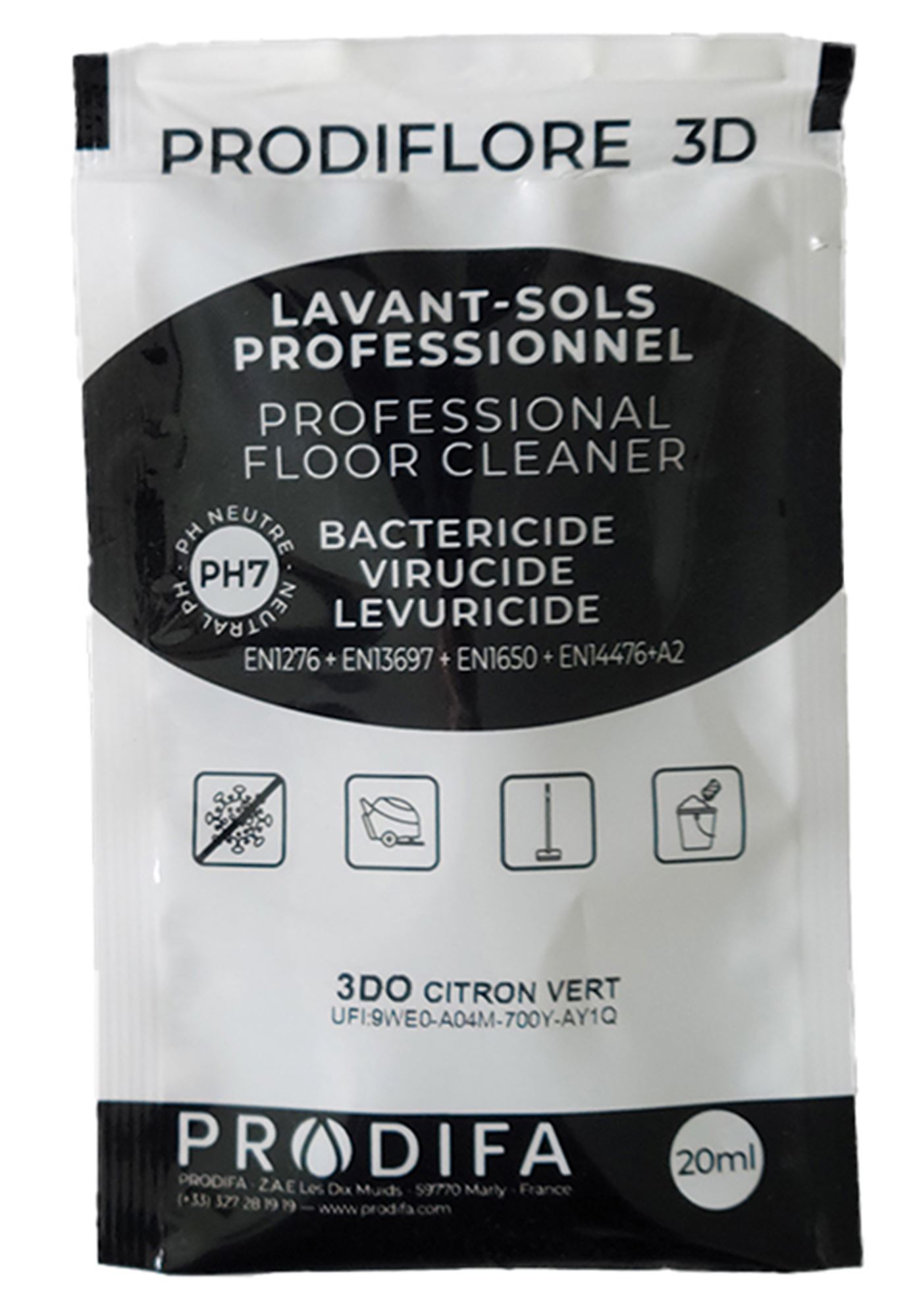 3D disinfectant and deodorizing detergent. Floor and surface cleaner. pH neutral. Complies with EN14476, EN1650, and EN1276 standards. For use in automatic scrubbers or flat mopping. Lime scent. 5-liter container.