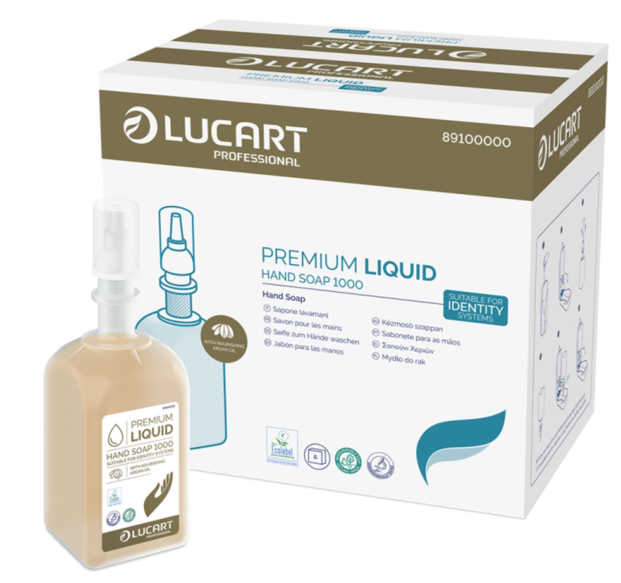 Lucart Premium Liquid Soap Cartridge 1000ml. Enriched formula with argan oil extract. Moisturizes and softens hands. Floral fragrance. For frequent use.