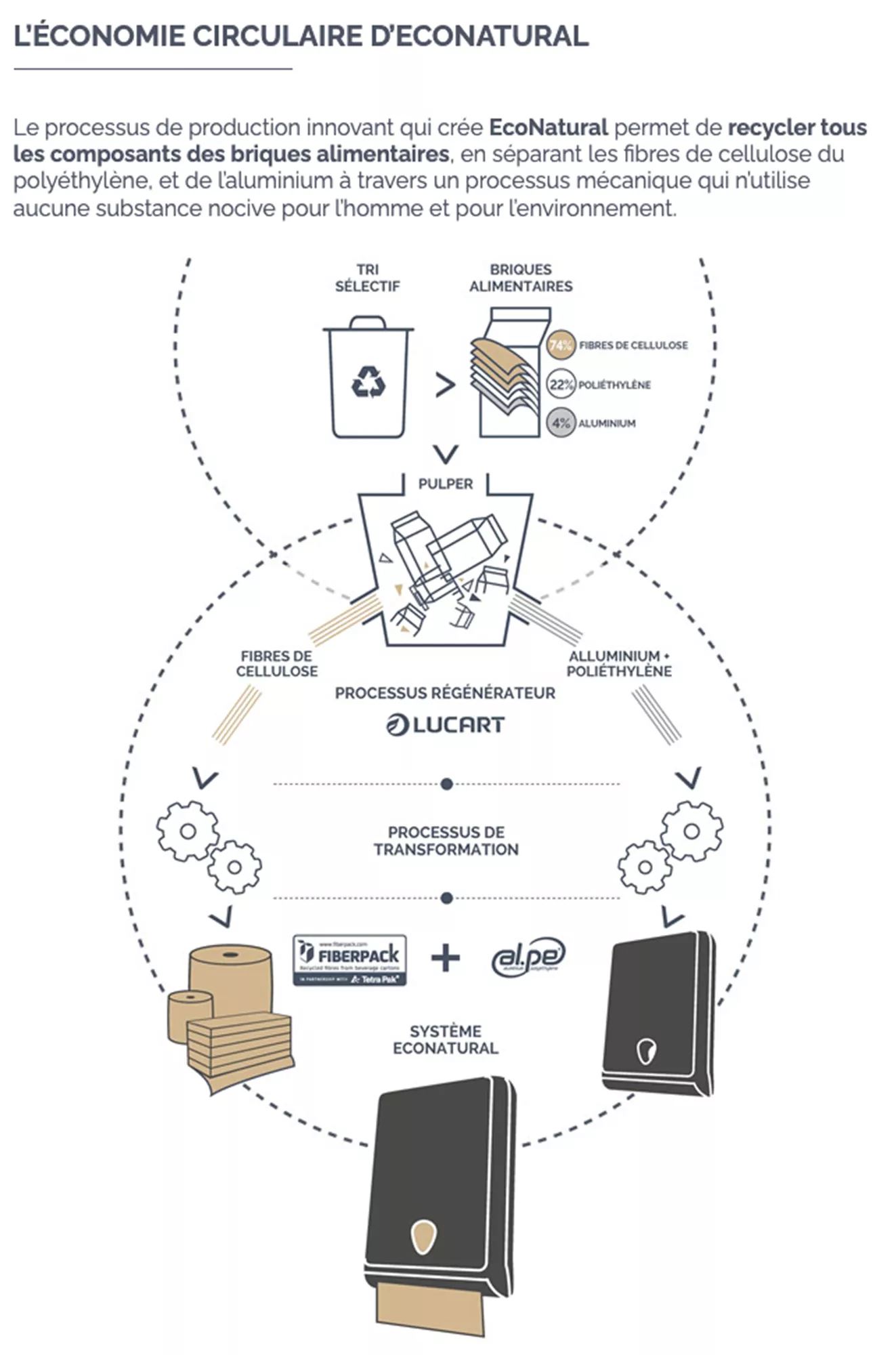 This pack of 6 rolls of 150 sheets each, with 3 plies , is very versatile, self-contained, and suitable for equipping all your bathrooms. EcoNatural 6.3 toilet paper rolls are made from Fiberpack®, a new raw material derived from recycled food cartons. Lucart Professional is giving food cartons a second life!