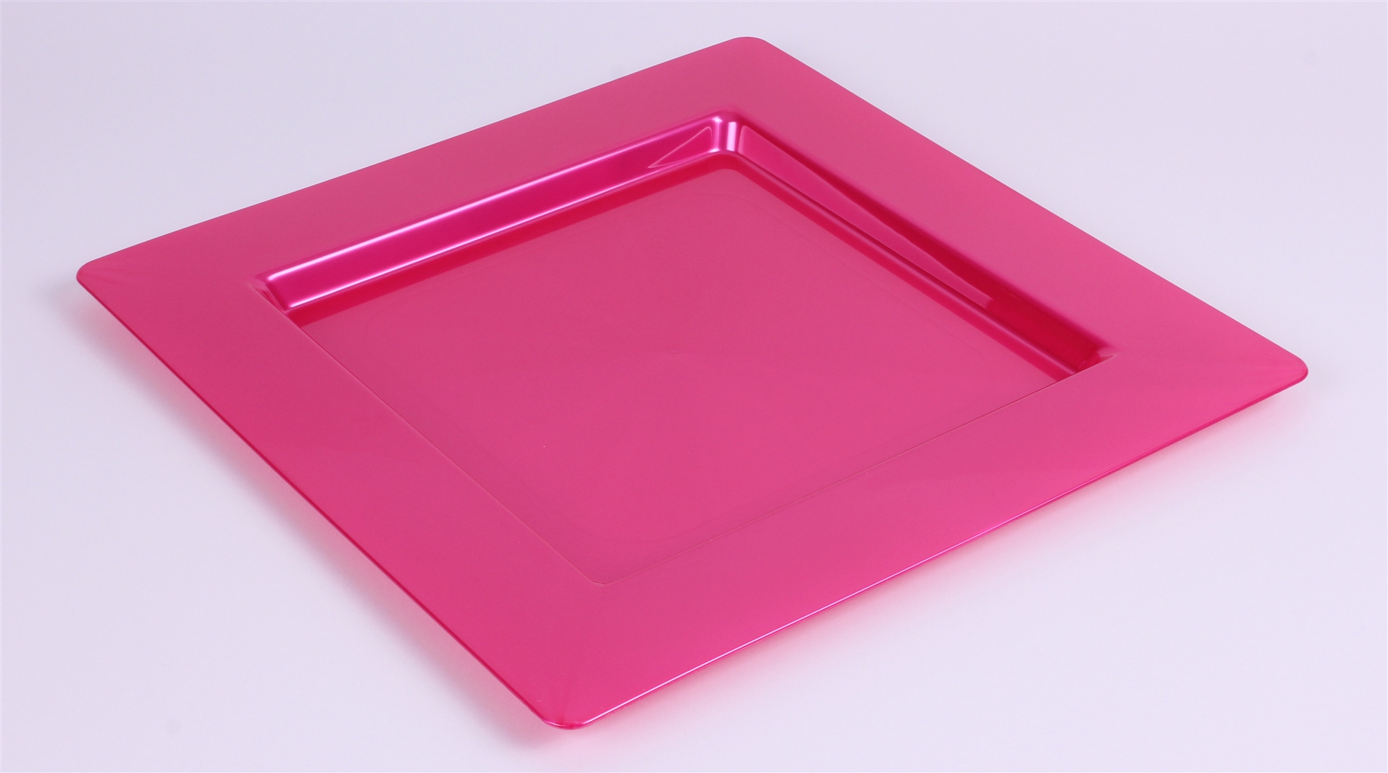 Reusable plastic underplate in magenta color, square shape 298x298 mm. Underplate made in France in PS. Reusable and food contact.