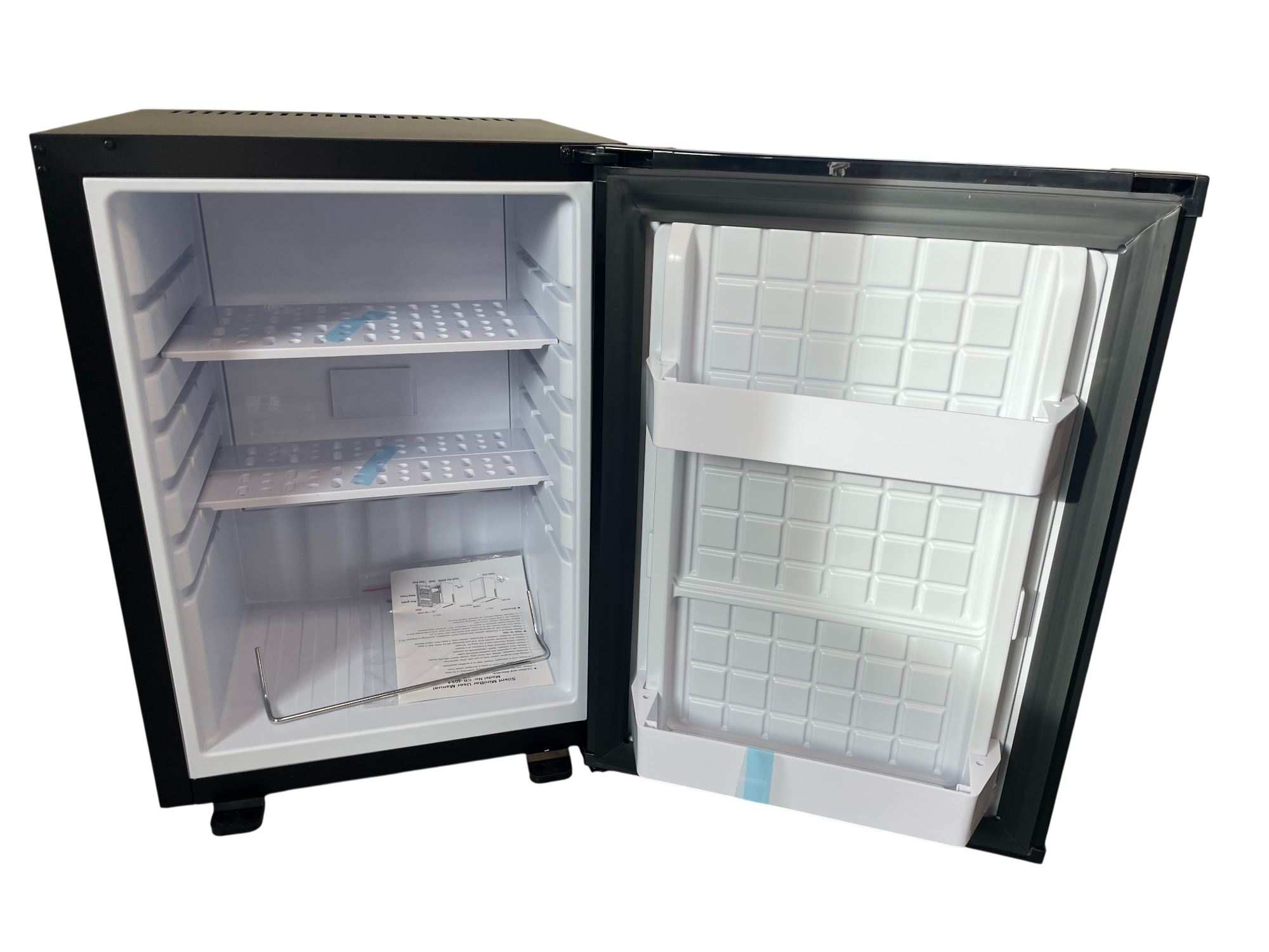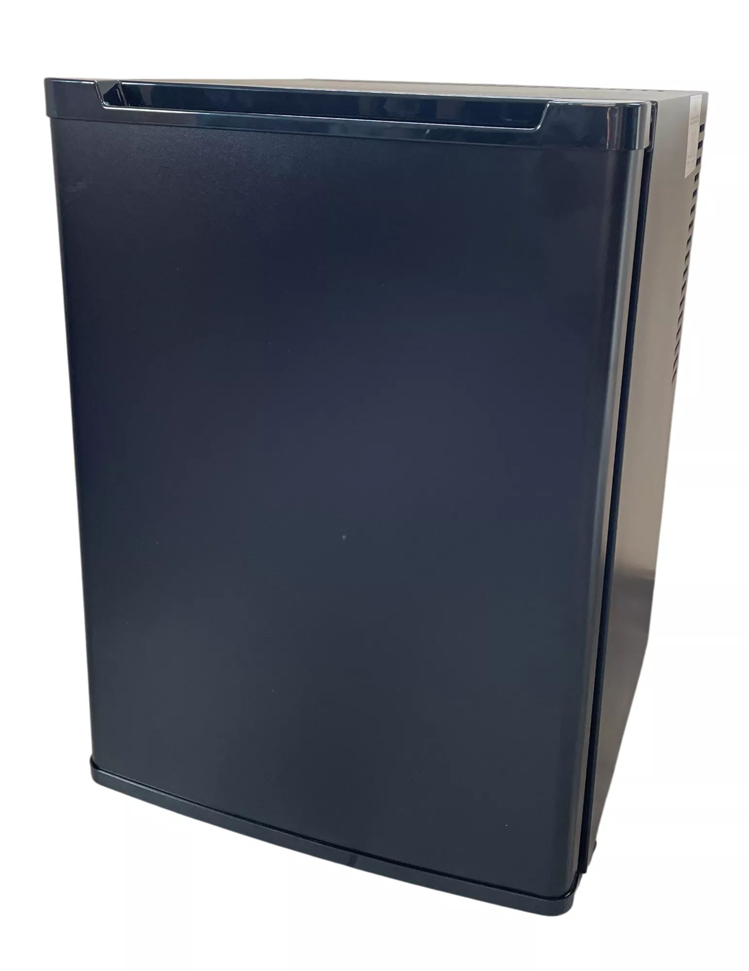 Hotel minibar with a generous 40-liter capacity. This minibar is eco-friendly as it is CFC-free and economical with a 66% reduction in energy consumption. Solid black door model.
