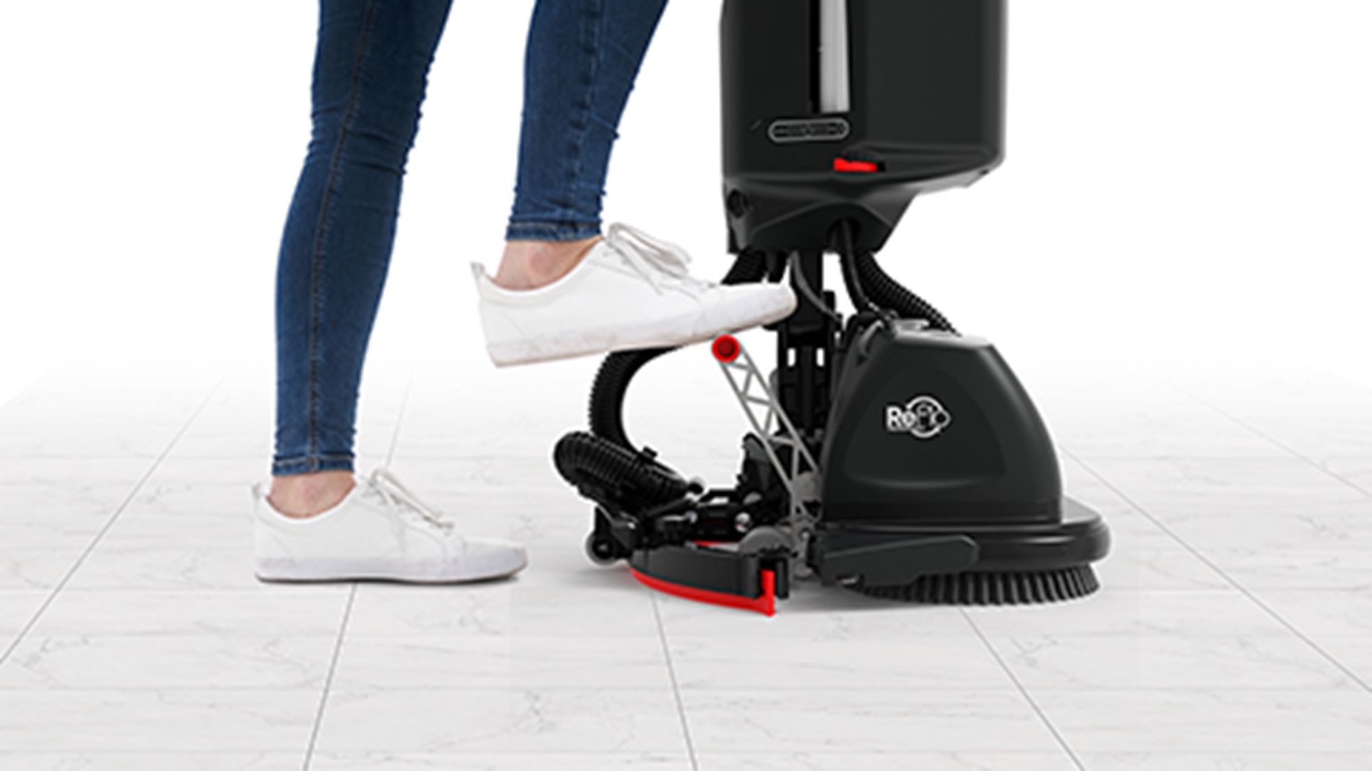 The Nu-Clean 440NX Lithium battery-powered scrubber dryer features an intuitive control panel. Its centrifugal diffusion water distribution system saves up to 80% of water, and its foot-operated squeegee reduces the risk of musculoskeletal disorders .