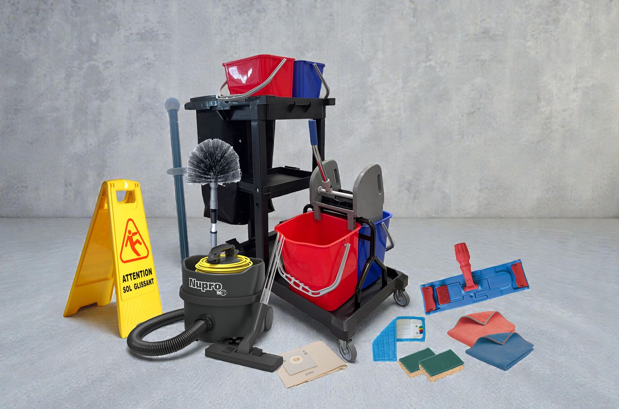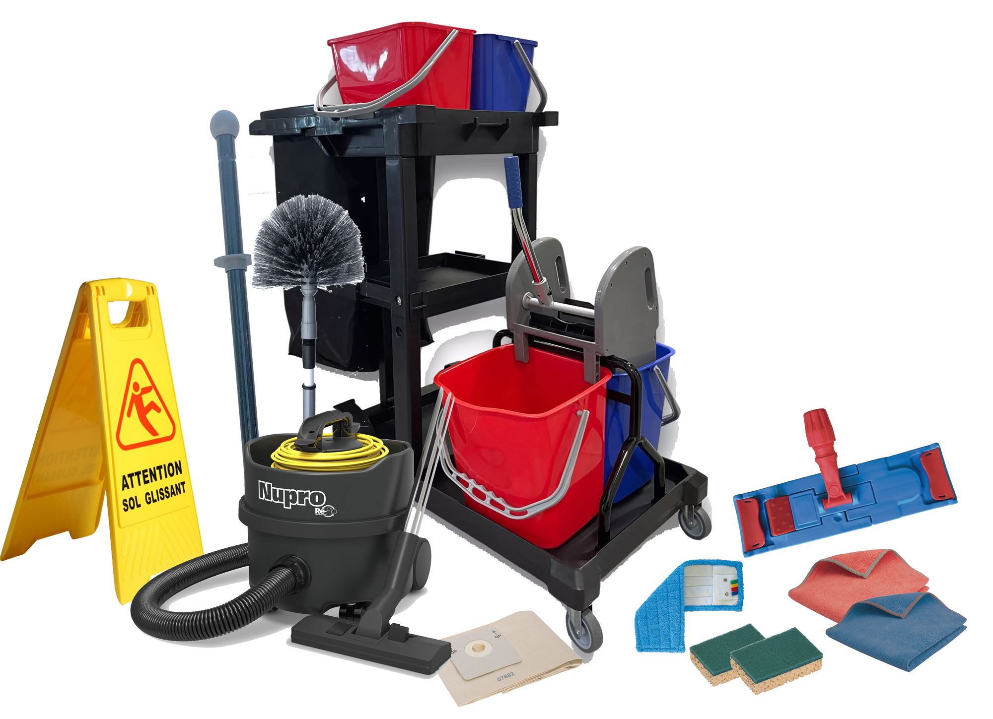 The pack comes with a Numatic Nupro vacuum cleaner, which is the reference for professionals, including a bag pouch.
