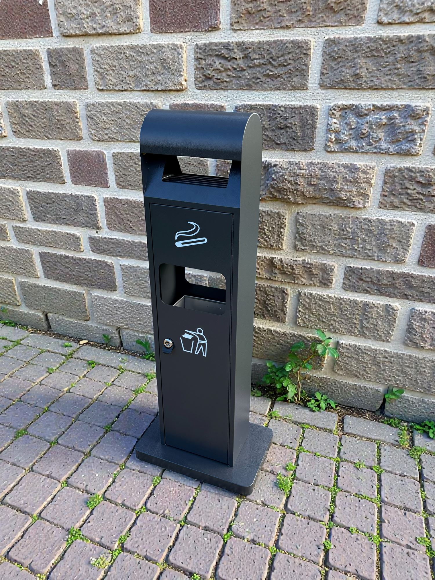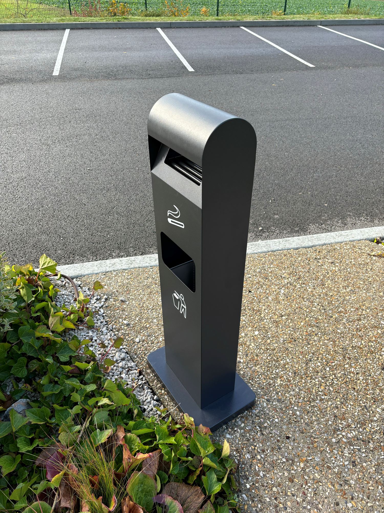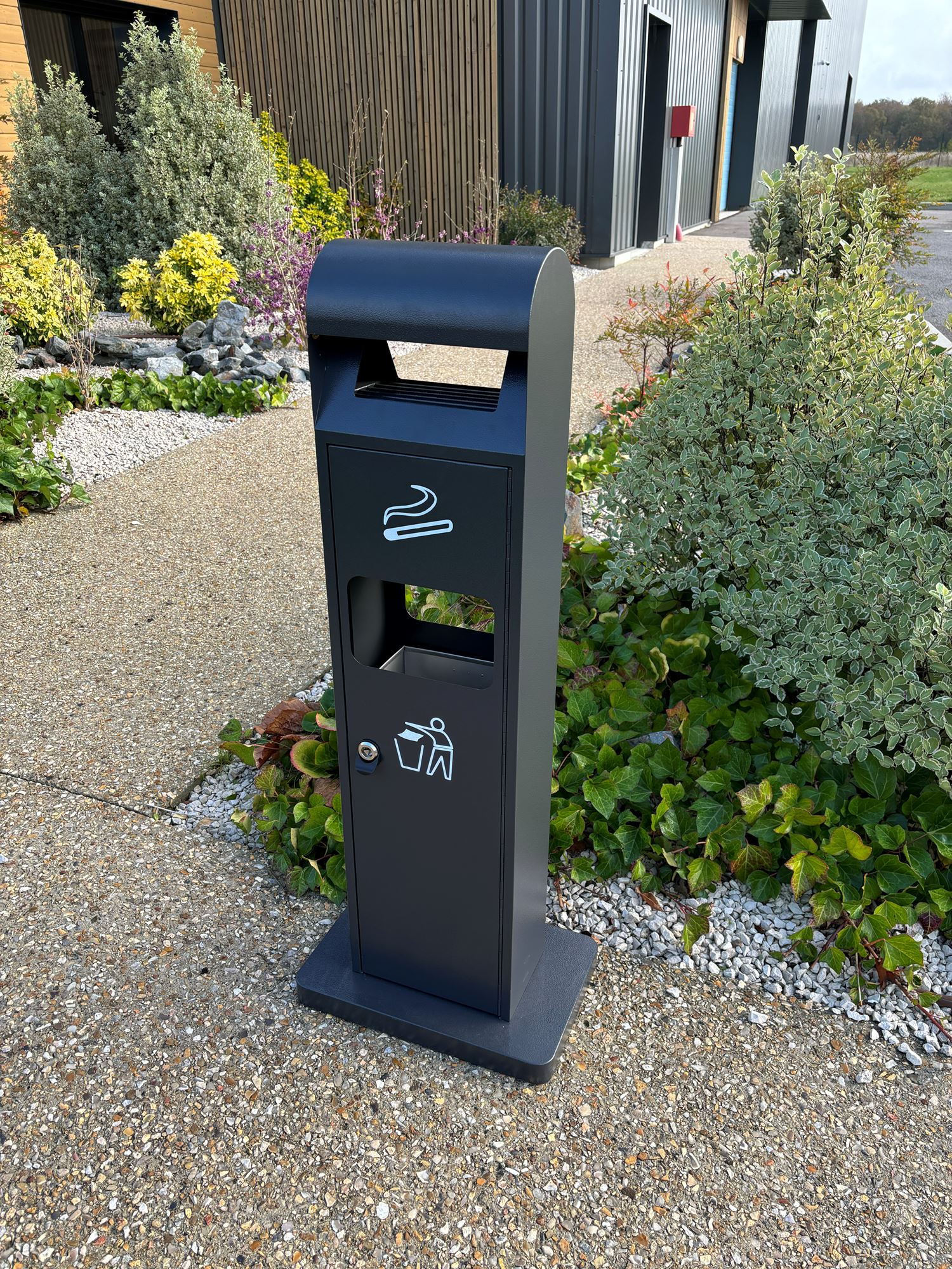 Its dual function in terms of waste collection allows it to process both cigarettes and general waste . A recycling sticker (optional) can be affixed to the front of the bin to facilitate sorting.