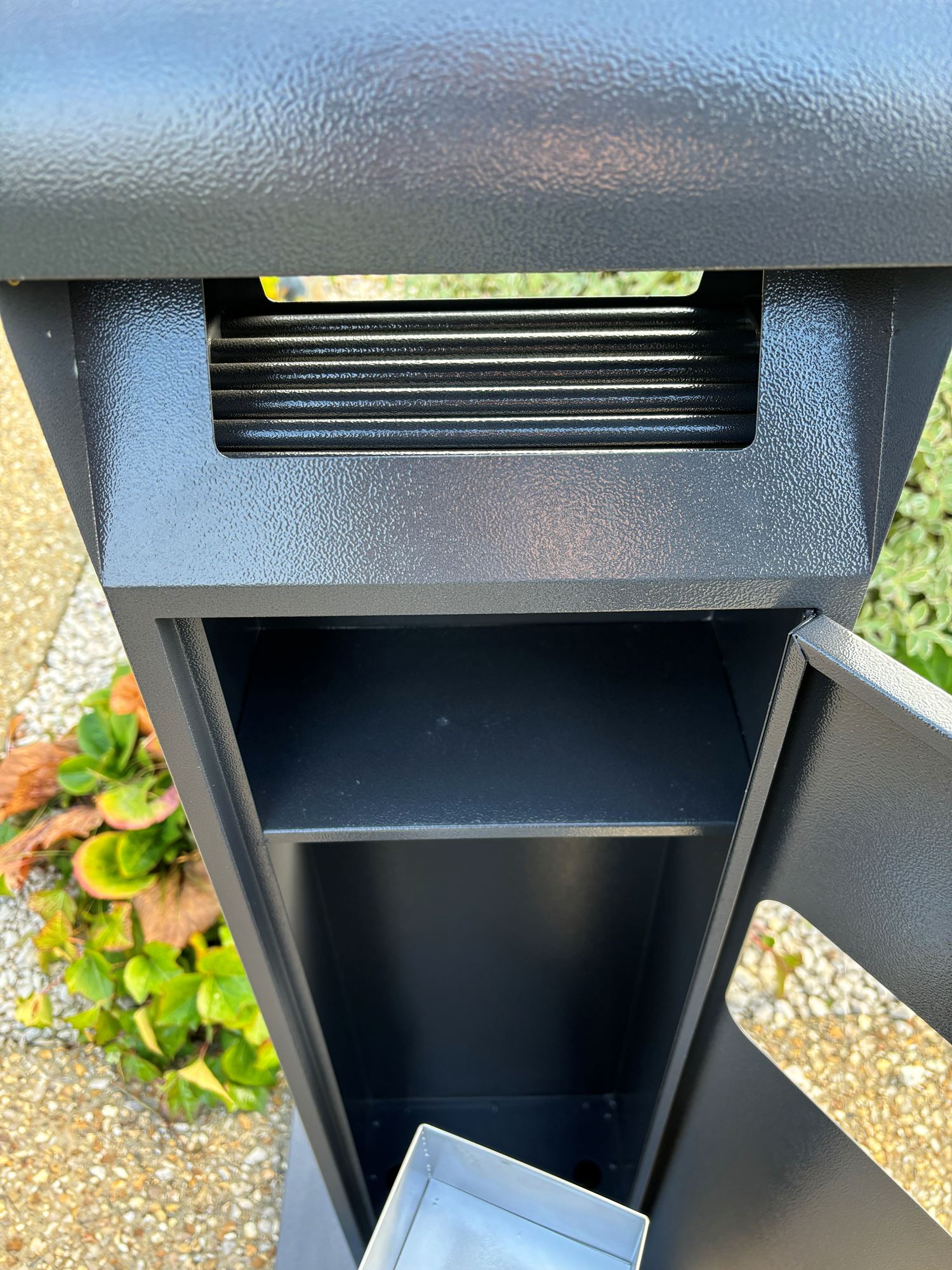 Easy maintenance, key included. Cigarette butt crushing plate and stainless steel lock.