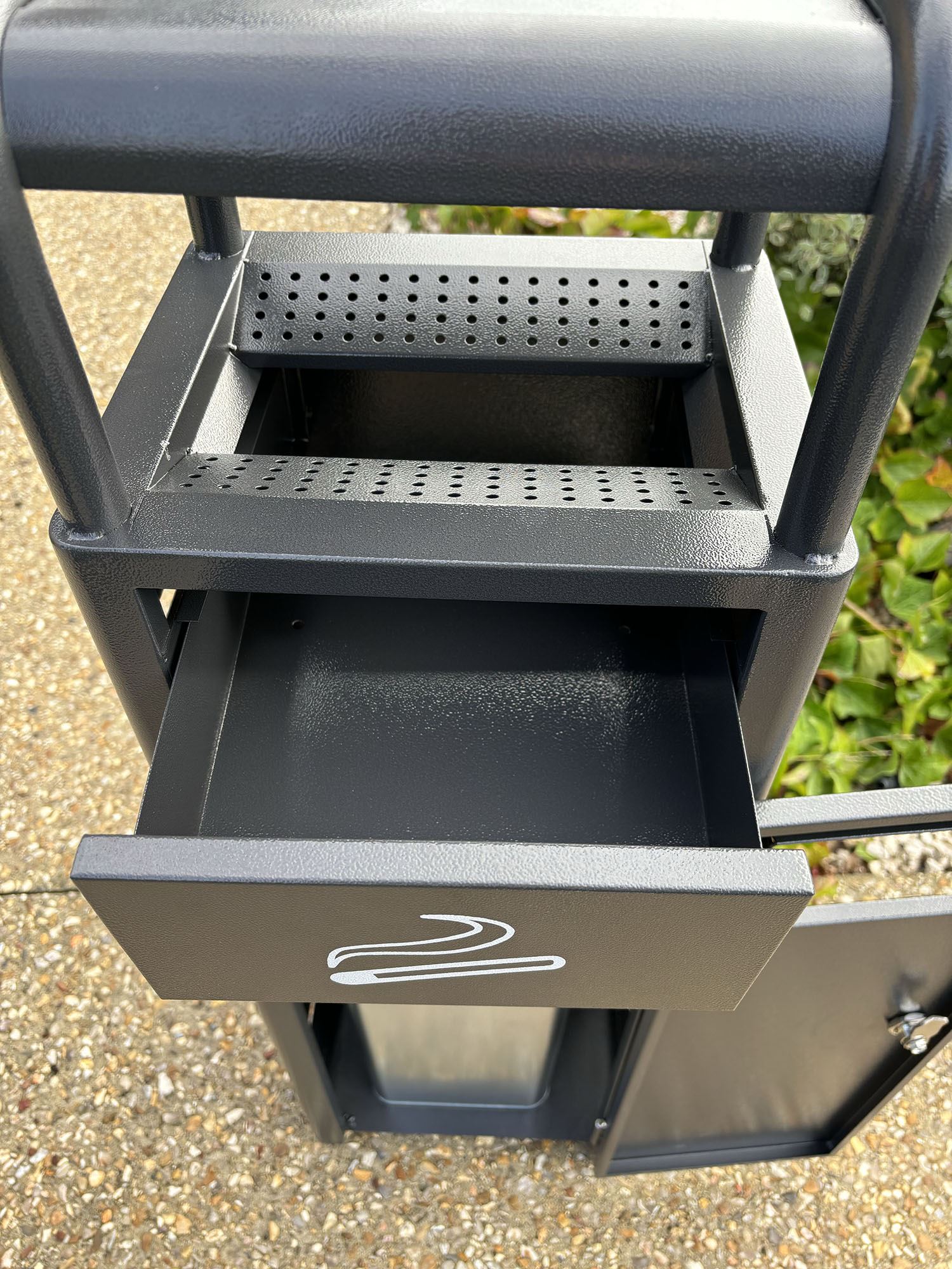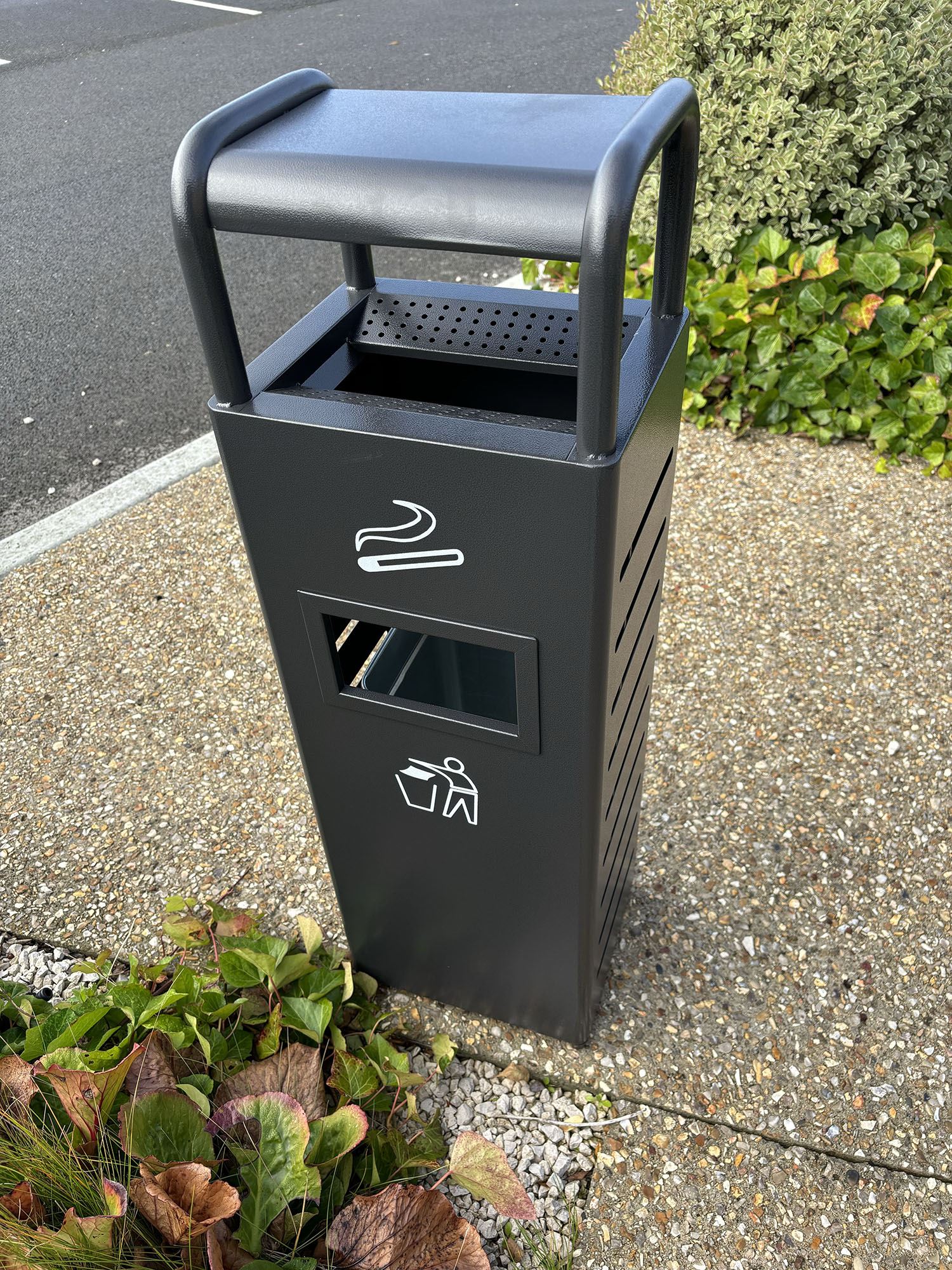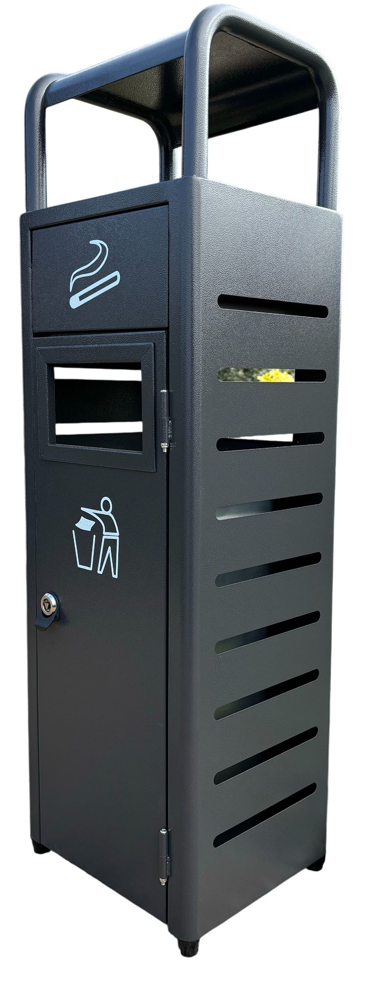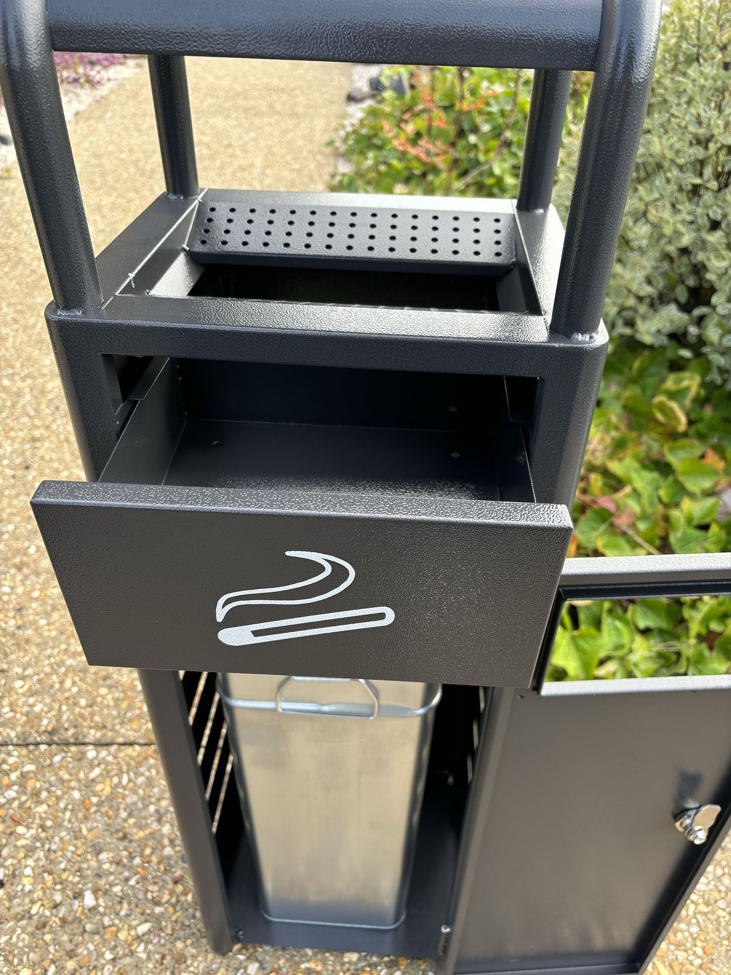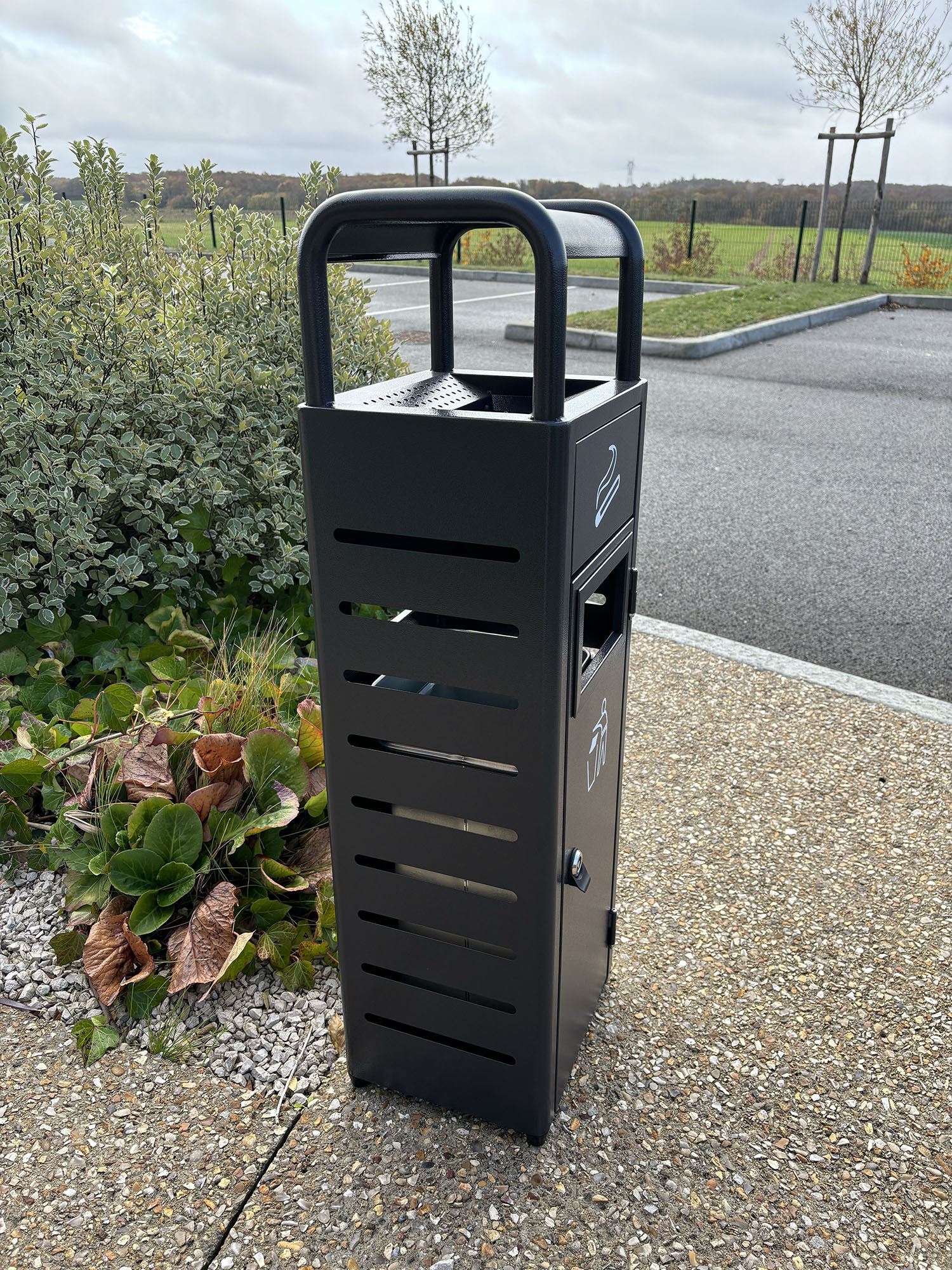 Ideal for outdoor spaces, including designated smoking areas and waste collection points. Do you have large spaces and high traffic areas? This large-capacity bin with an integrated ashtray is the perfect solution for park entrances, shopping centers, train station entrances, airport entrances, commercial parking lots, public spaces, beach areas, amusement parks, and more.