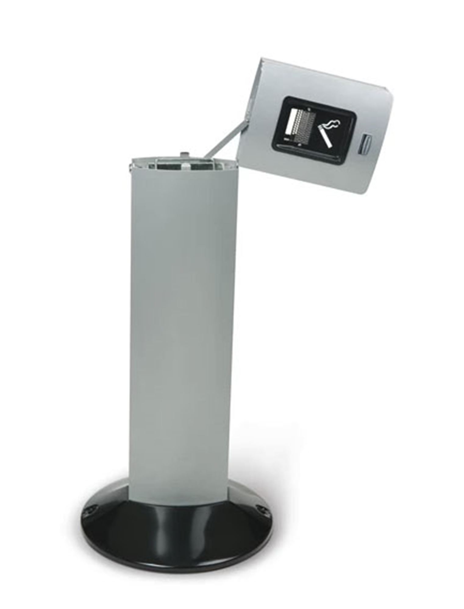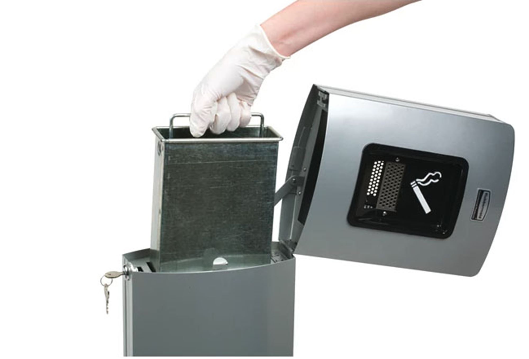 Metropolitan Smoker's Station from Rubbermaid is a large capacity metal outdoor ashtray. Water resistant finish with durable Koat plain coating. Weighted base boltable to the ground. Integrated key lock secures the lid.