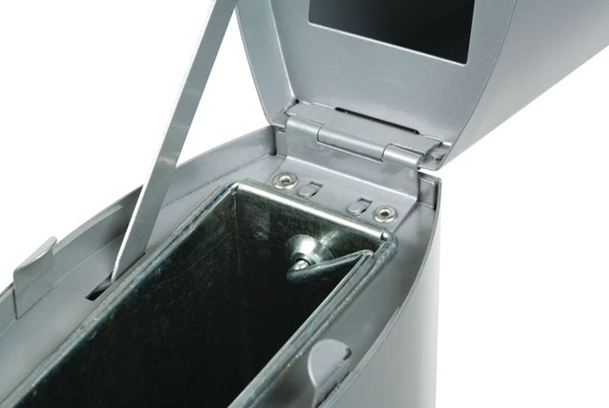 The lid opens by tilting on a hinge and provides access to the 6 liter galvanized collector which simply lifts, empties and replaces.