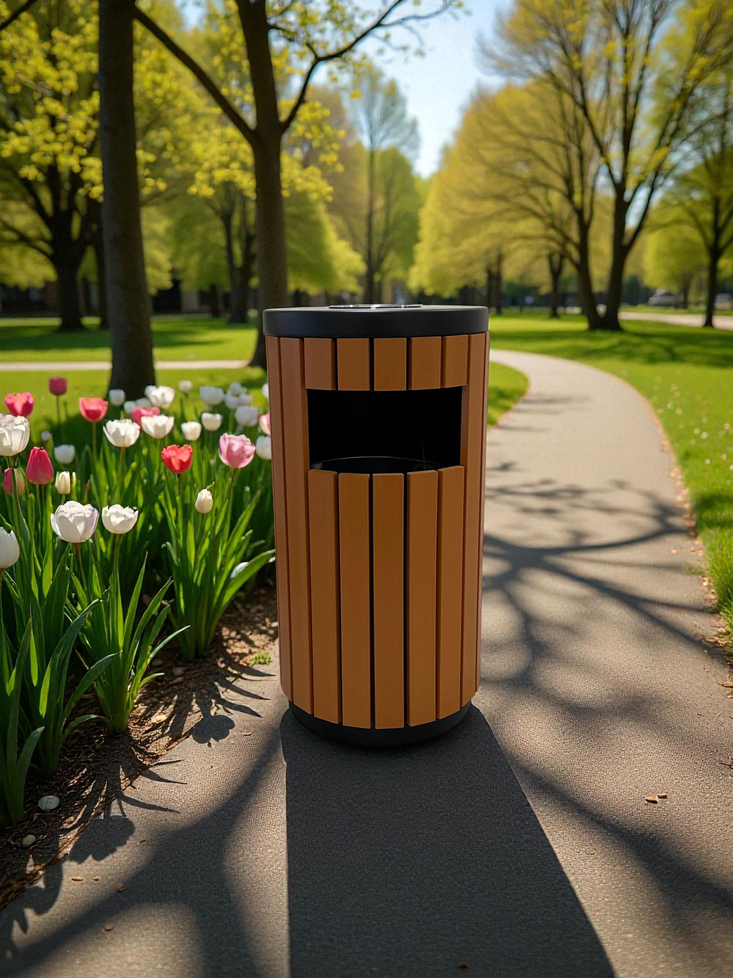 Trash can with slats with plastic coating with wood effect.