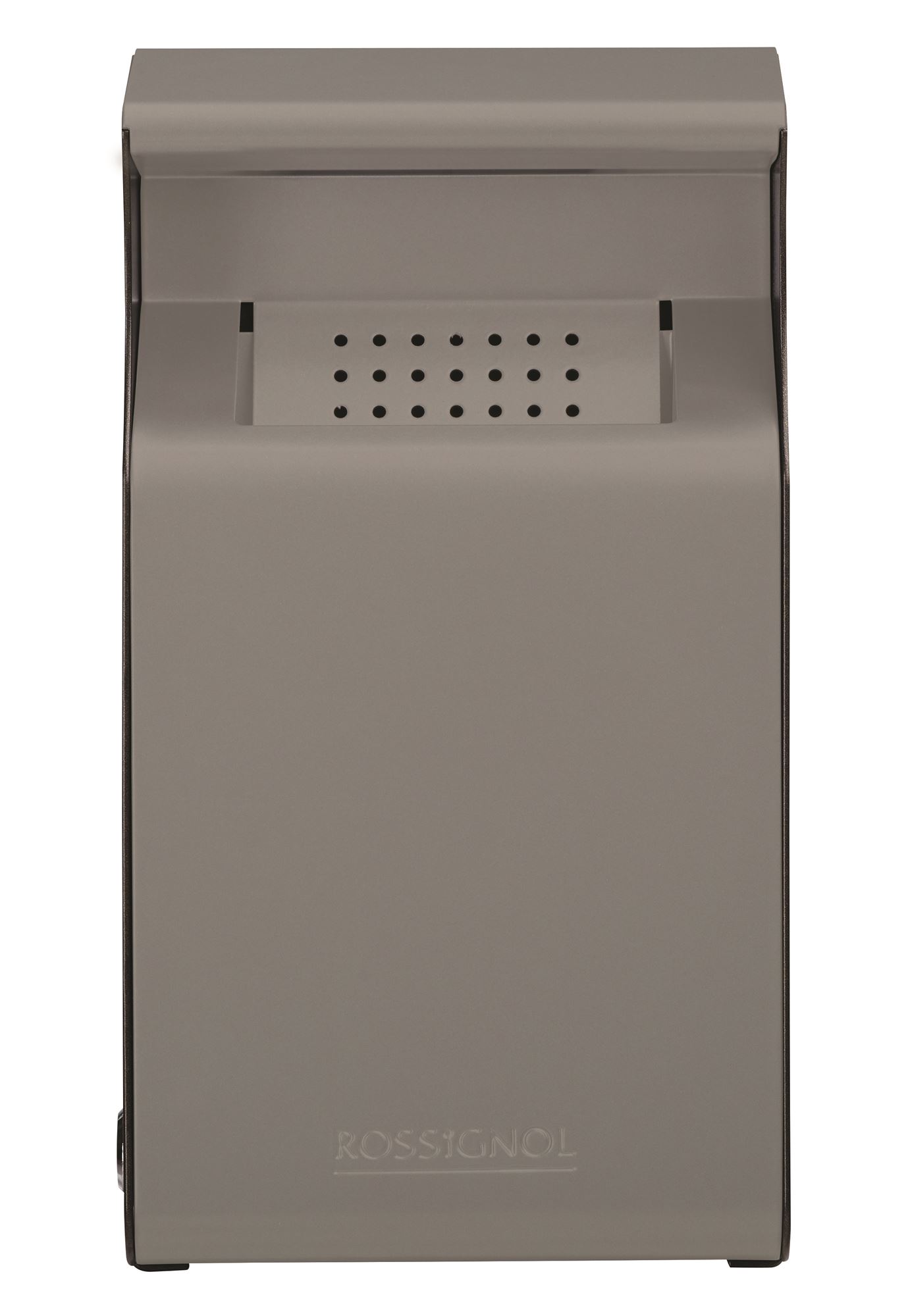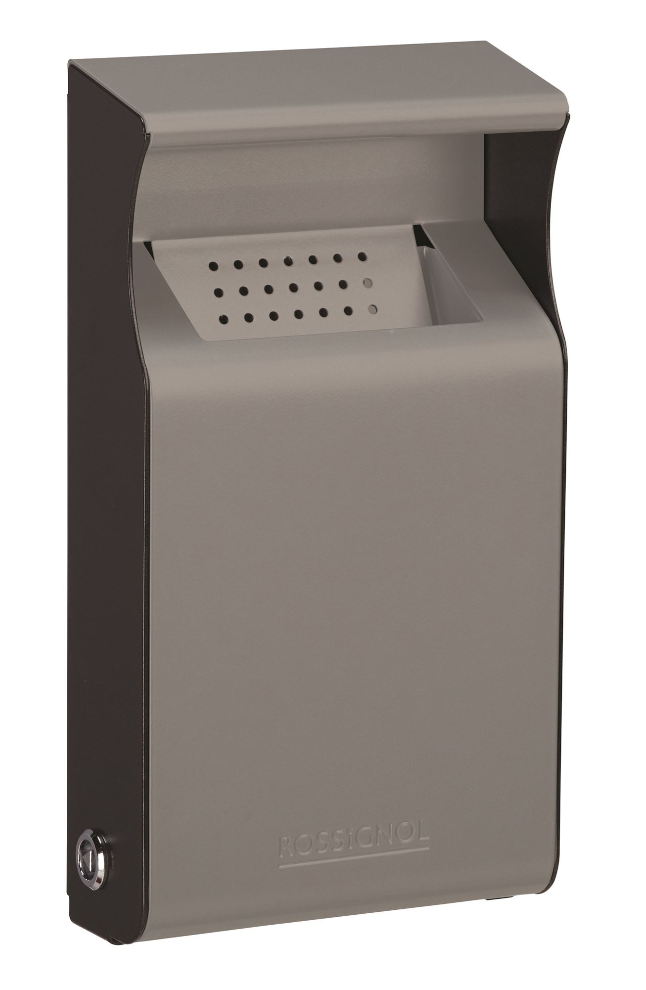 Rossignol Kopa line wall-mounted outdoor ashtray, new model. A new line of ashtrays with a contemporary design and colors that blend seamlessly into your spaces with modernity and discretion. Wall-mounted model with triangular key lock. 1 liter capacity, corresponding to 600 cigarette butts. Cigarette butts are not visible in the reservoir.