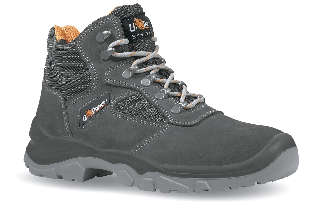 Real Upower high-top safety shoe in suede leather. Steel toe cap. Comfort insole. Anti-perforation steel midsole. S1P SRC