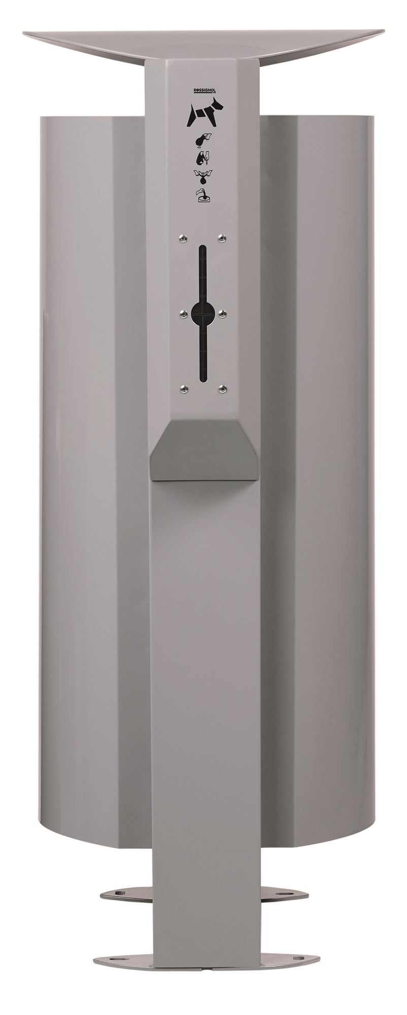 The Arkea dog waste bin includes a 100L free-standing bin and a dog waste bag dispenser. Available in RAL9006 aluminum gray. Made in France by Rossignol.