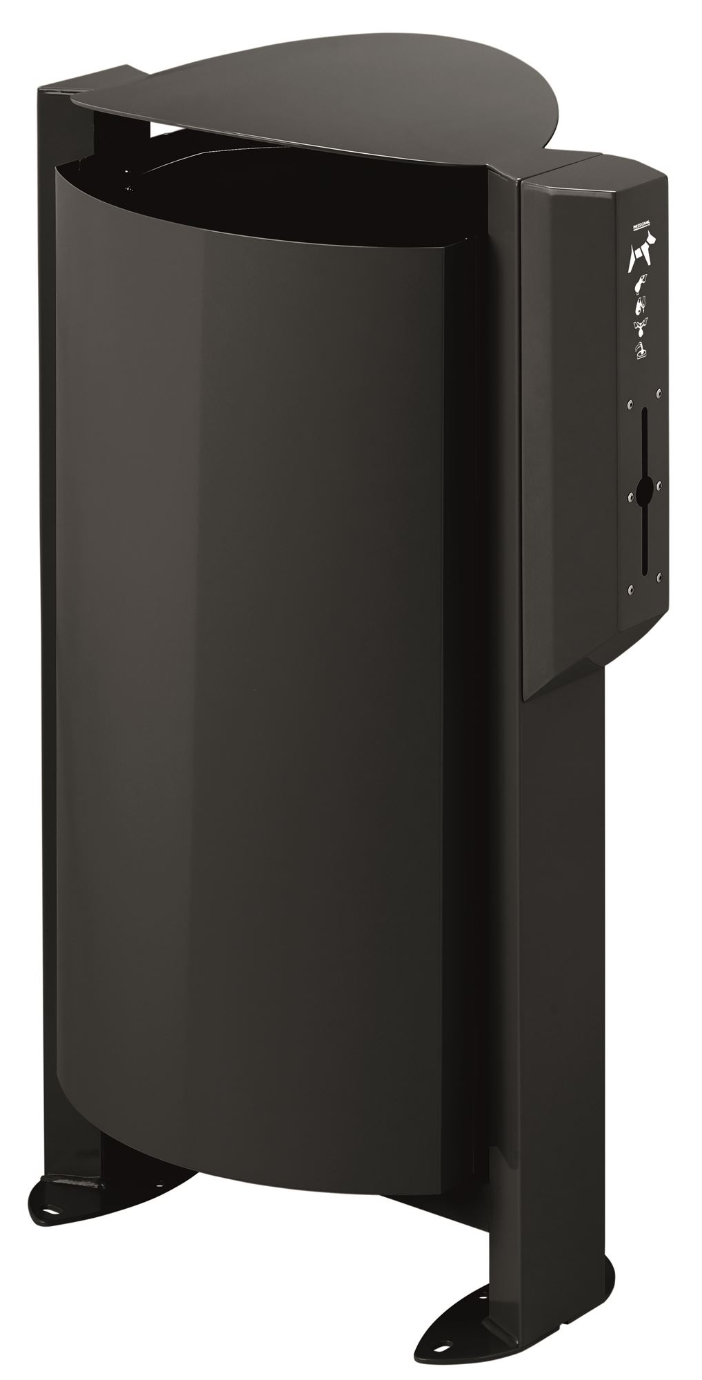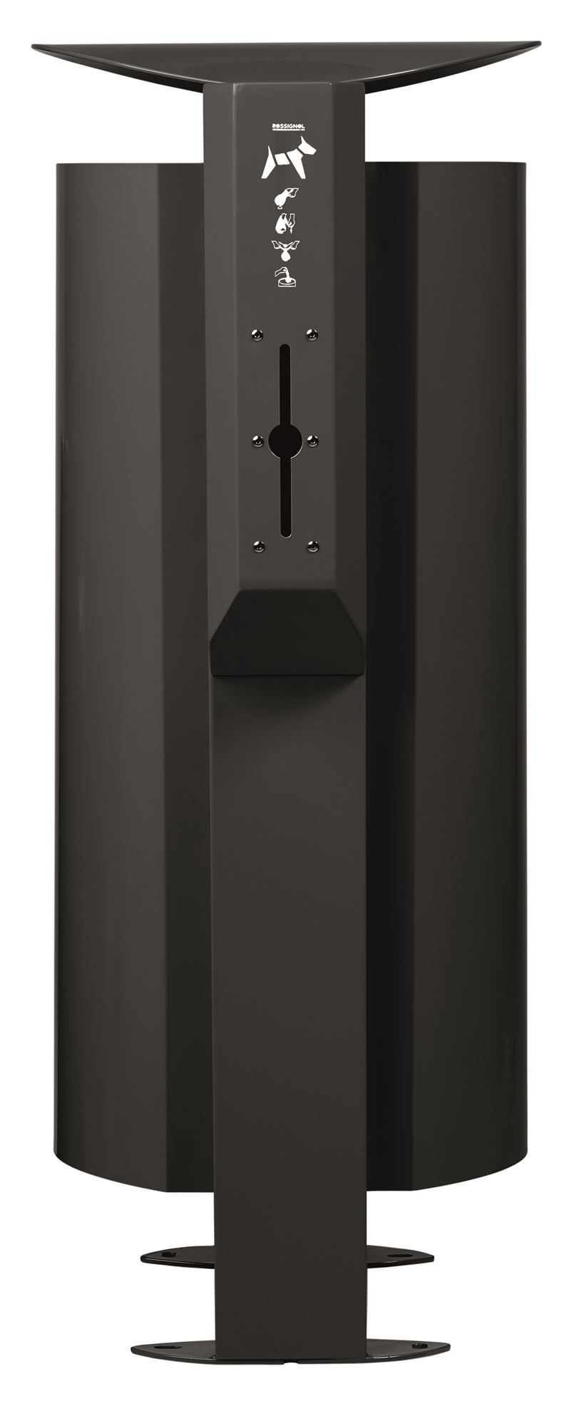 The Arkea dog waste bin includes a 100L free-standing bin and a dog waste bag dispenser. Manganese gray color. Made in France by Rossignol.