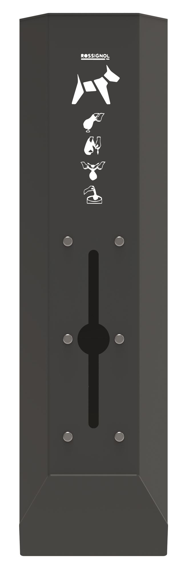 The Arkea Rossignol wall-mounted dog hygiene dispenser attaches to the wall. It holds 200 dog hygiene bags. For outdoor use. Made in France. Available in a matte anthracite RAL7016 color.