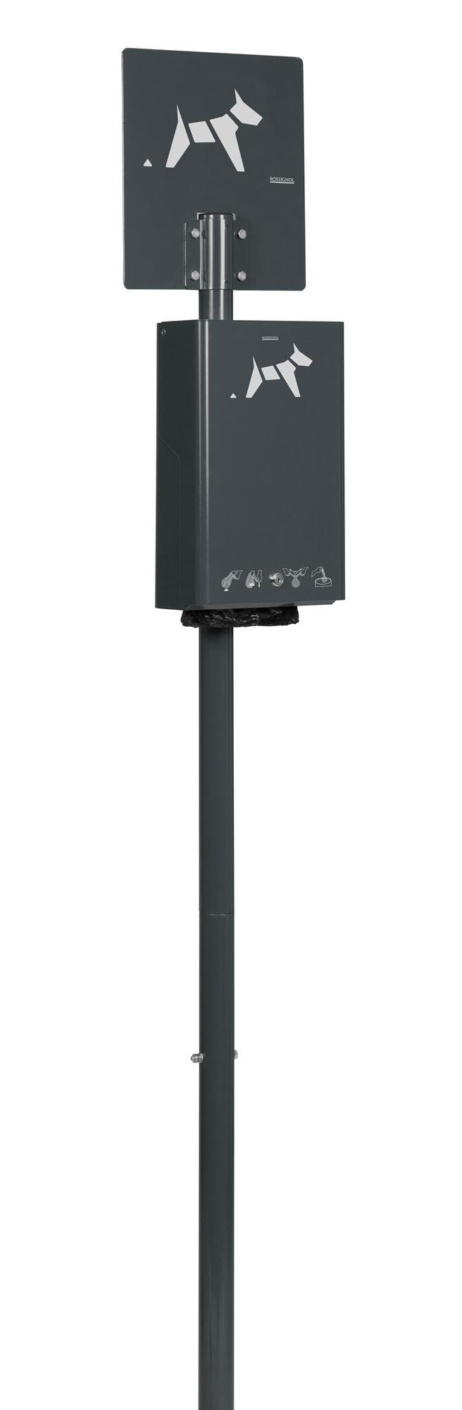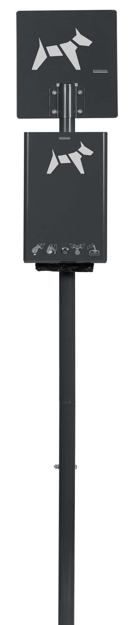 Dog litter box on a matte anthracite post. Made in France by Rossignol. Consisting of a totem, a 500-bag dispenser, and a post.