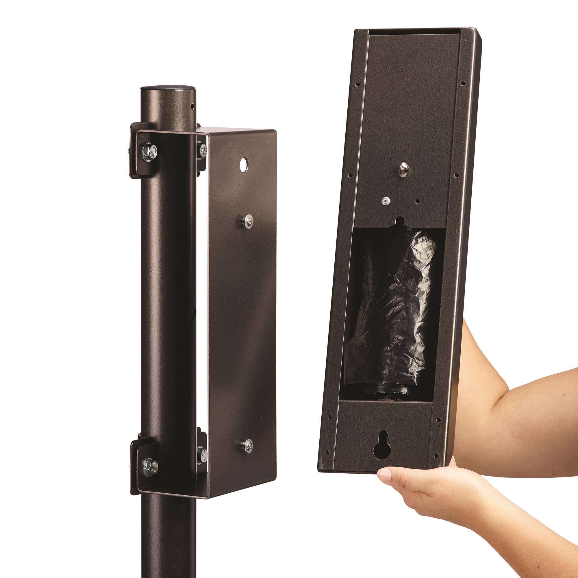 The Arkea Rossignol dog hygiene dispenser attaches to an existing 50 mm diameter post. It holds 200 dog hygiene bags. For outdoor use. Made in France.