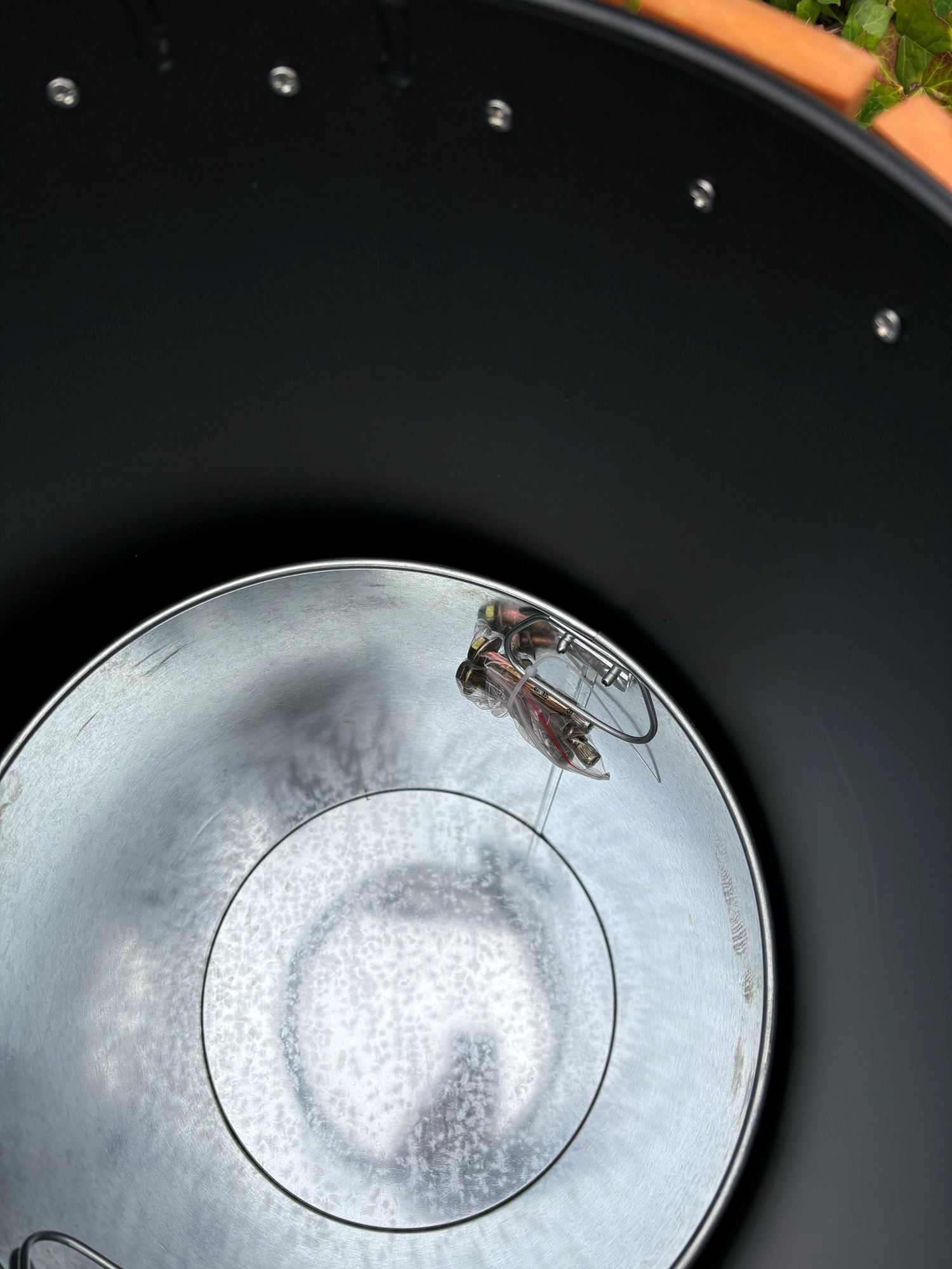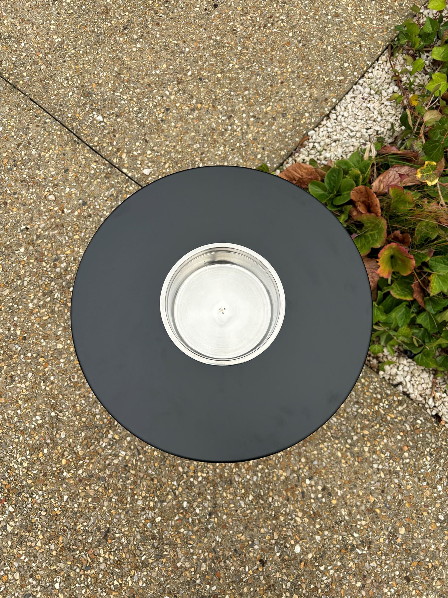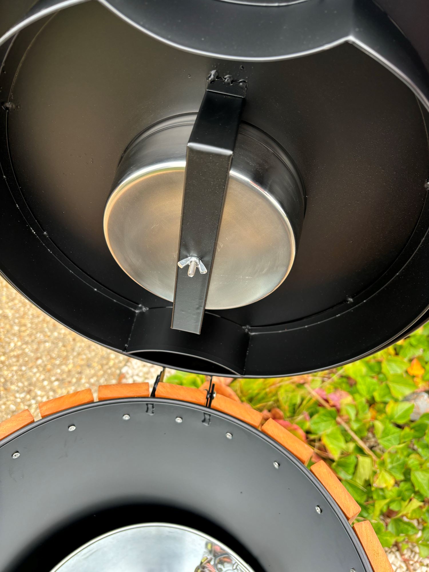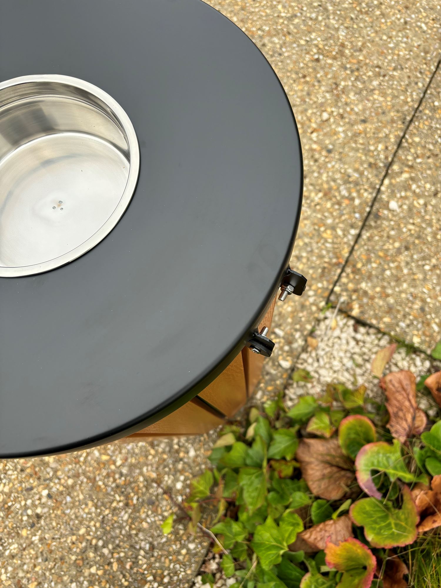 This bin has an inner galvanized steel container with handles for easy transport and emptying, and an ashtray.
