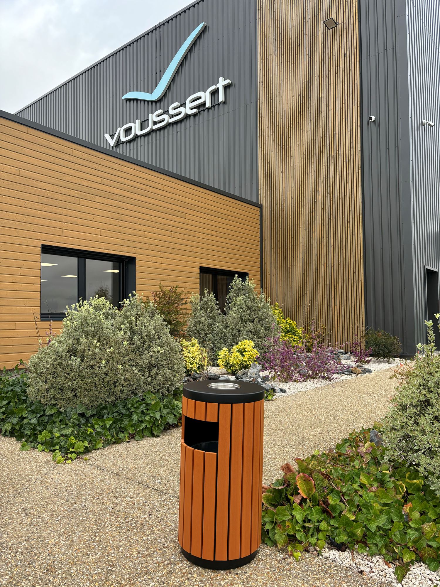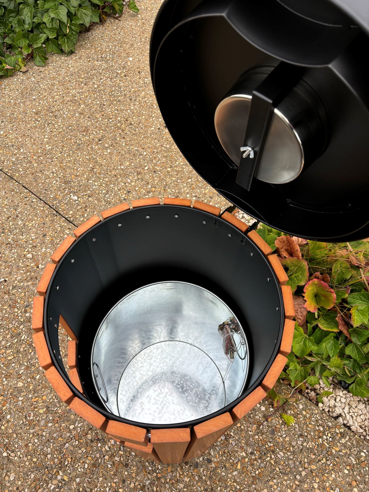 The ECL15 outdoor ashtray bin is a round bin with a robust steel frame and wood-effect plastic slats. It features a galvanized steel inner bin and an ashtray.