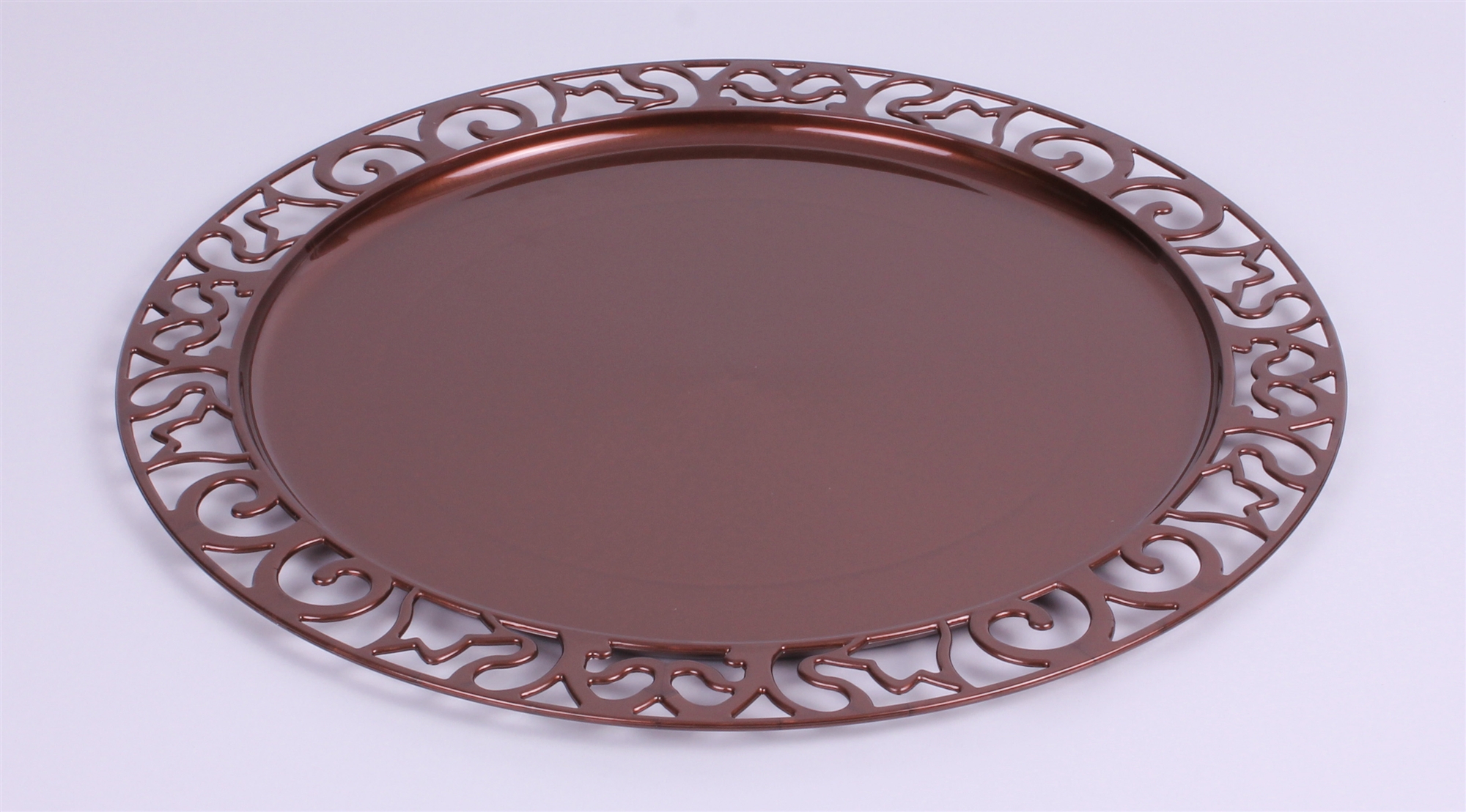 Reusable plastic underplate in chocolate color, round shape, diameter 300 mm. Underplate made in France in PS. Reusable and food contact.