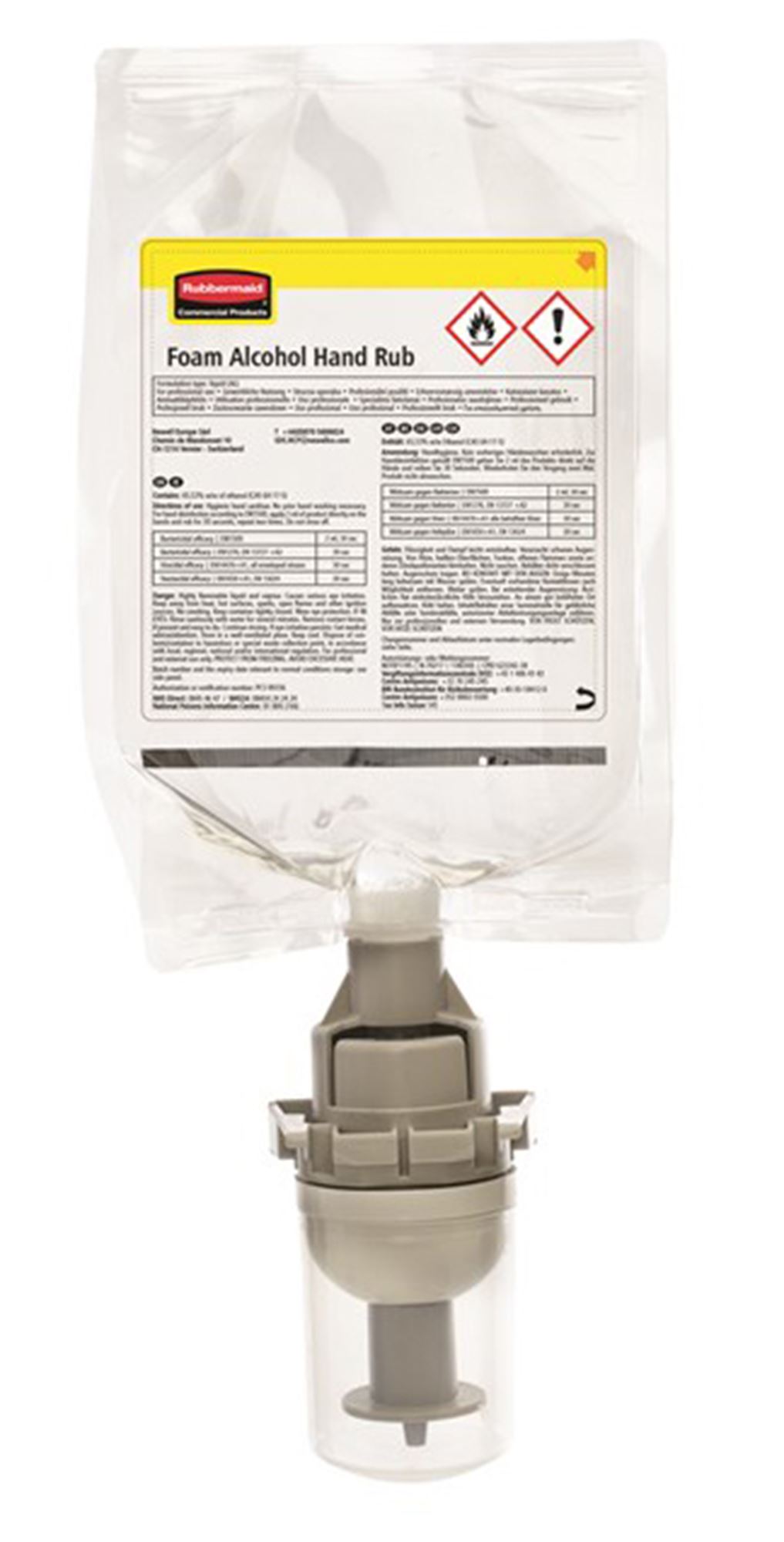 Rubbermaid Flex hydroalcoholic foam is a cartridge foam for disinfection enriched with 75% alcohol for Rubbermaid Flex dispensers in 500 ml.