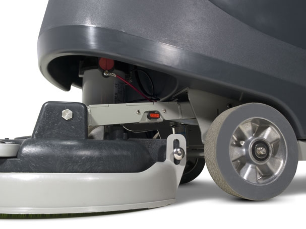 The motor / brush / squeegee assembly restores clean, dry floors (the semi-parabolic nozzle is floating).
