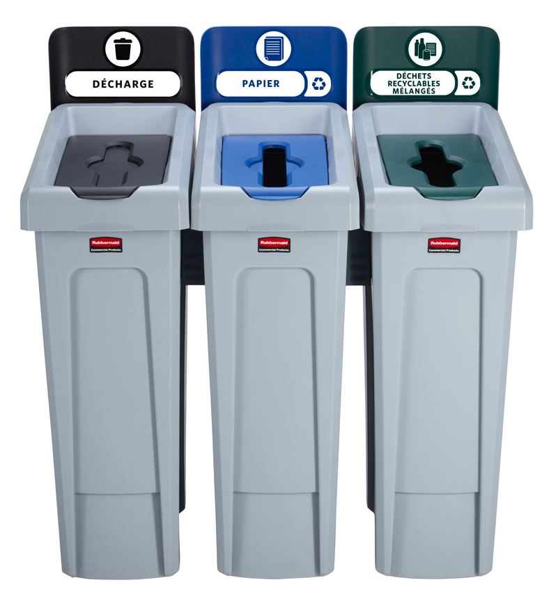 This Slim Jim selective sorting bin allows you to sort three waste streams: blue lid paper stream, green lid mixed recyclable waste and other gray waste (landfill). This module can then be enriched with other sorting flows thanks to the modularity of the Rubbermaid Slim Jim solution.
