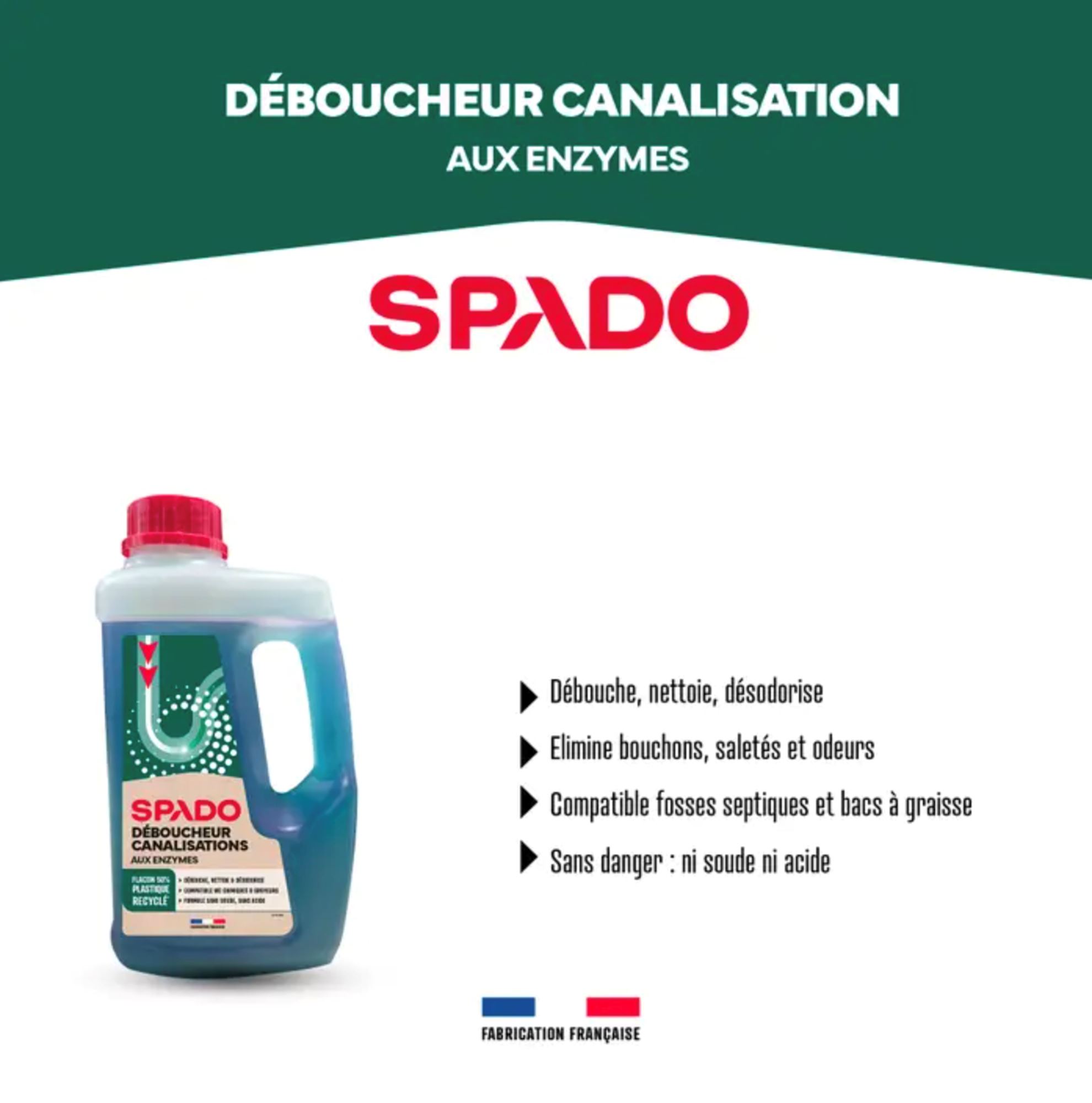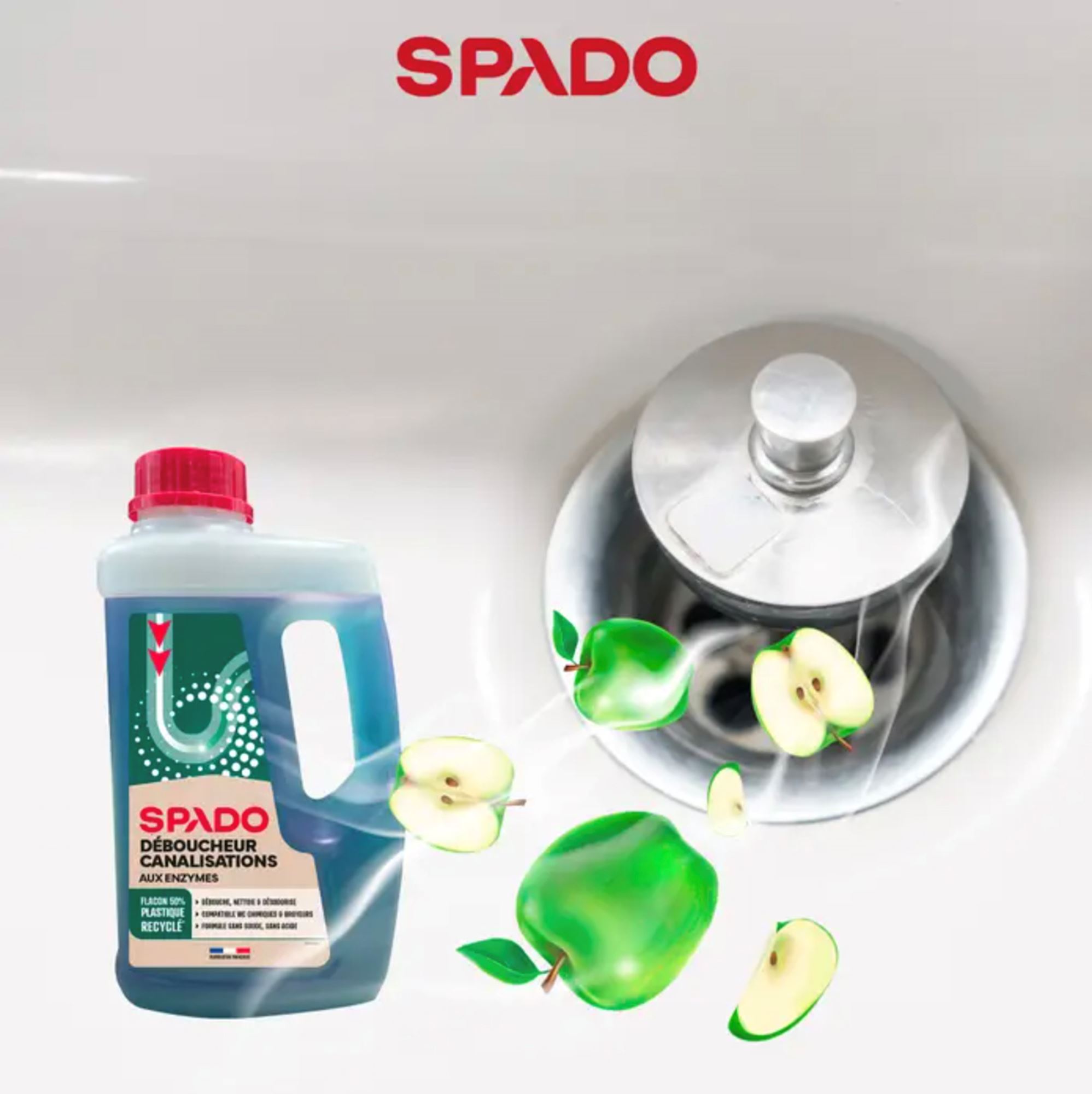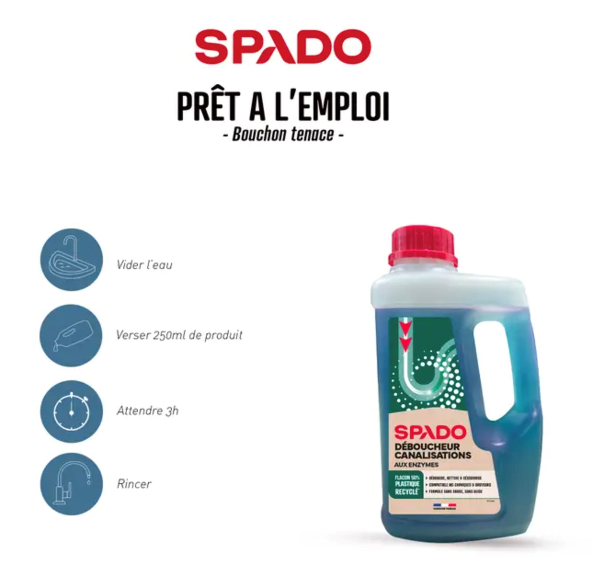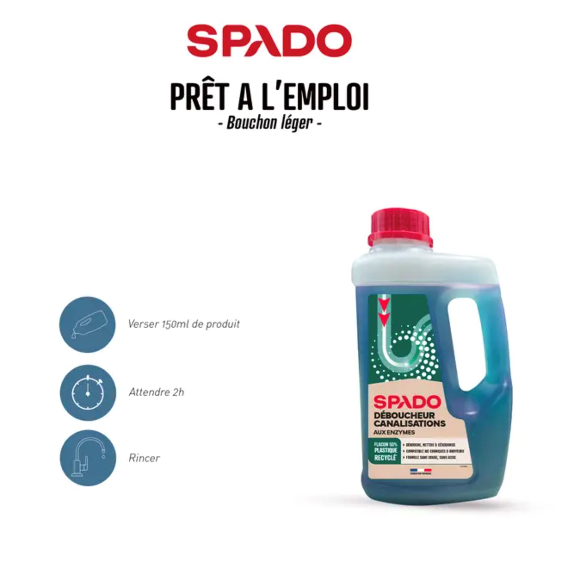 Looking to unclog your drains without using harsh chemicals? This biological liquid drain cleaner from Spado is the ideal professional product. It will leave a clean, fresh scent that will eliminate lingering odors caused by blocked pipes. Unlike conventional chemical drain cleaners, this product harnesses the power of biological enzymes to deeply dissolve the organic matter responsible for blockages: grease, soap scum, food scraps, and other deposits.