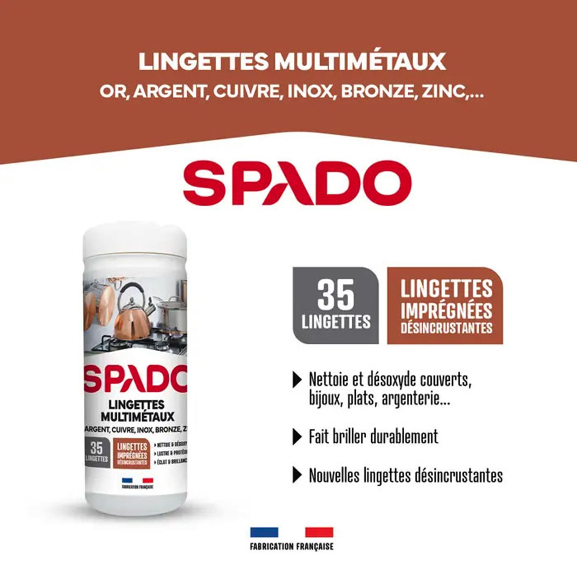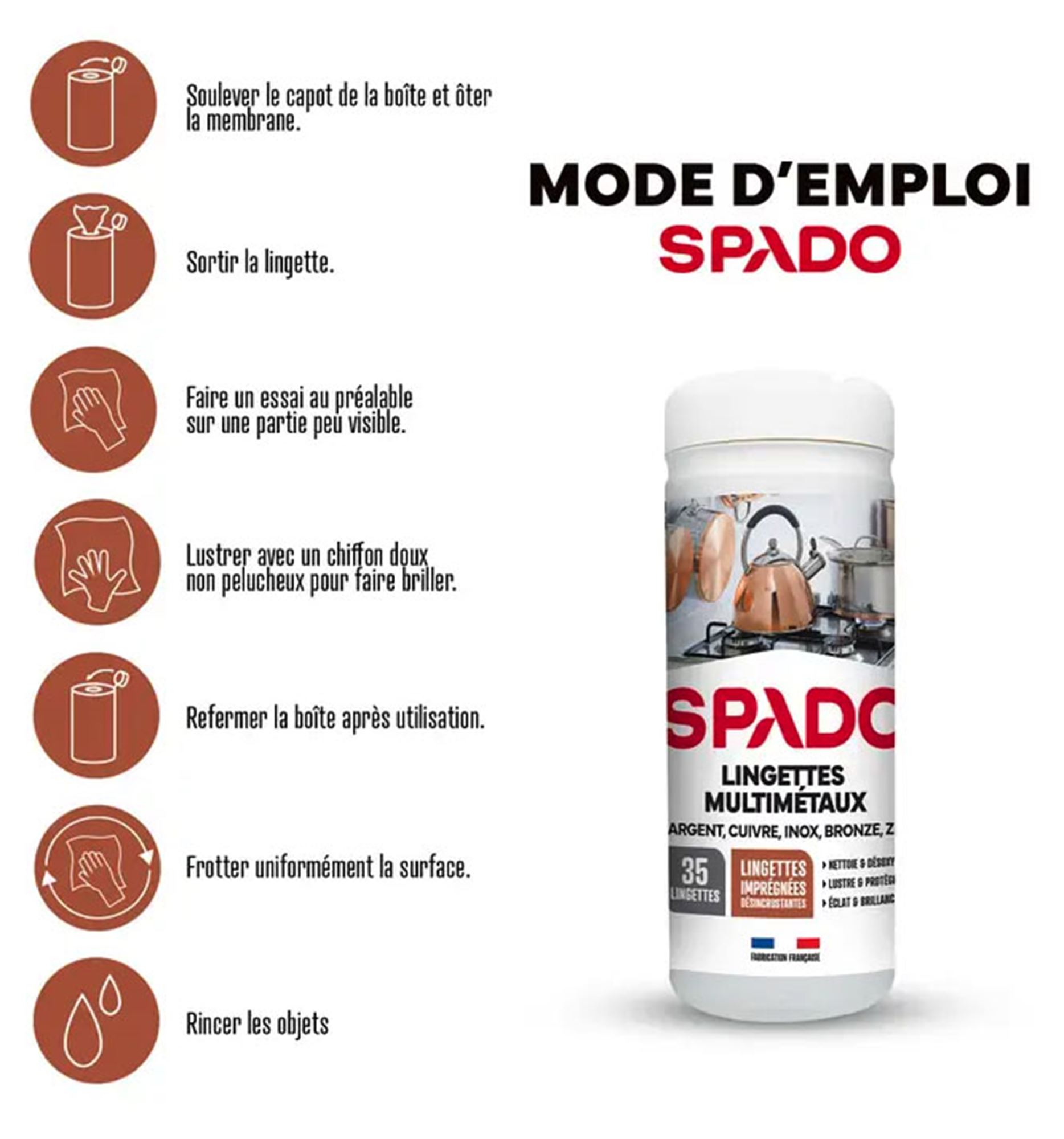 For effectively cleaning, removing oxidation, and shining all your everyday metal objects, Spado's metal cleaning wipes are ideal. Ready to use, they allow you to easily maintain metal surfaces without the need for any additional products.