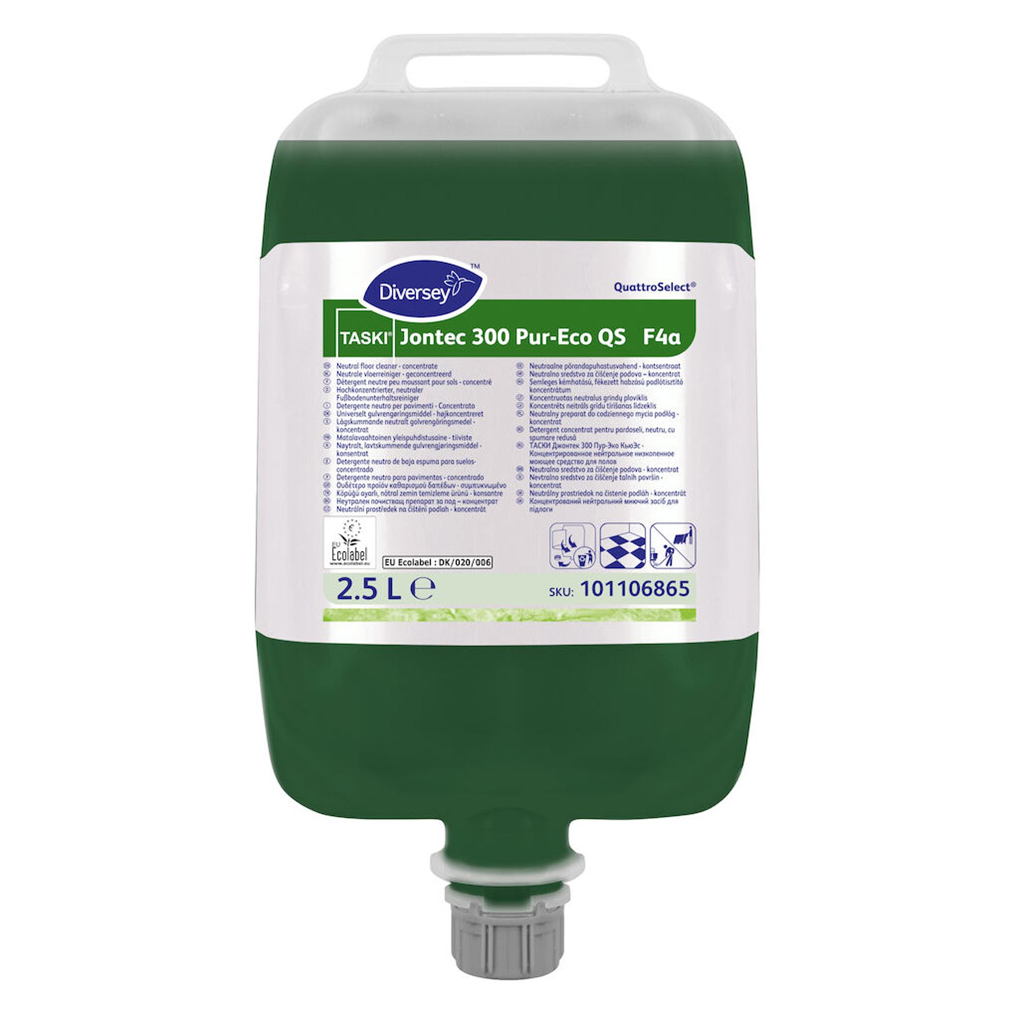 Taski Jontec 300 Pure Eco QuattroSelect. Concentrated, low-foaming, neutral floor detergent. Ideal for machine cleaning of washable floors, protected or not (PVC, linoleum, rubber, marble, etc.).